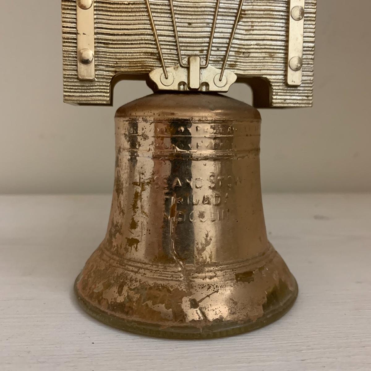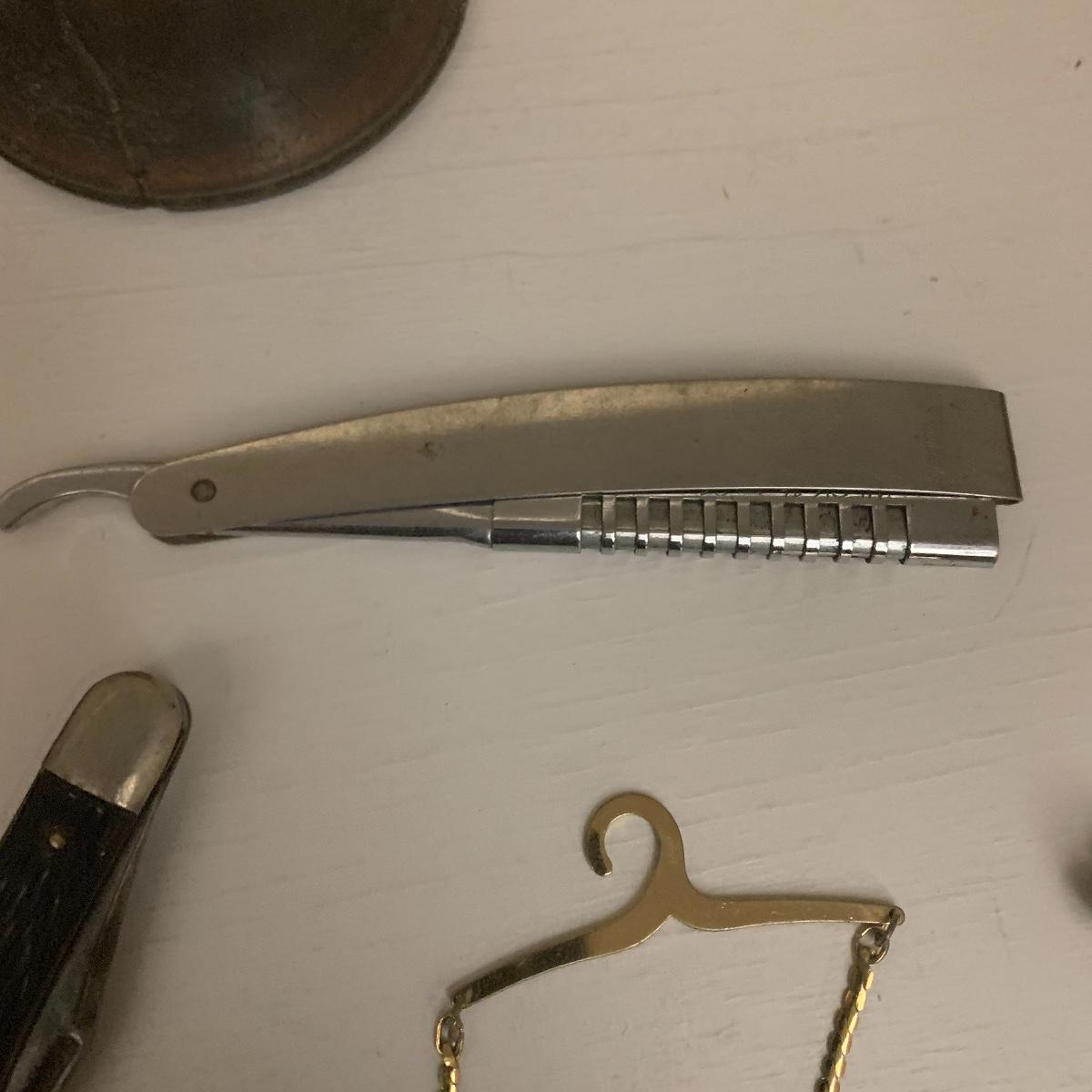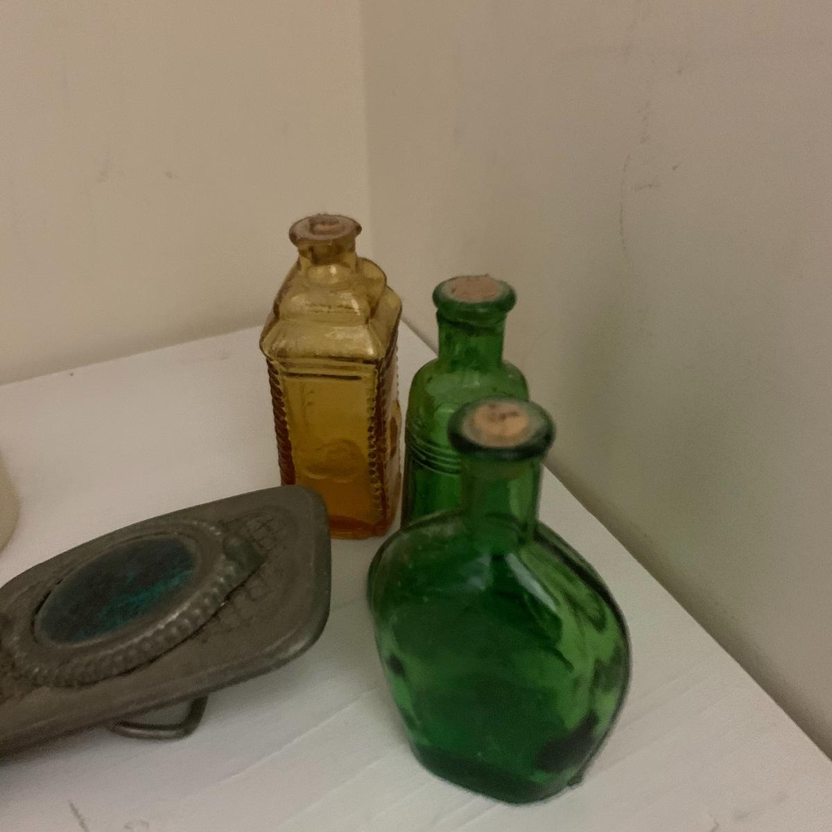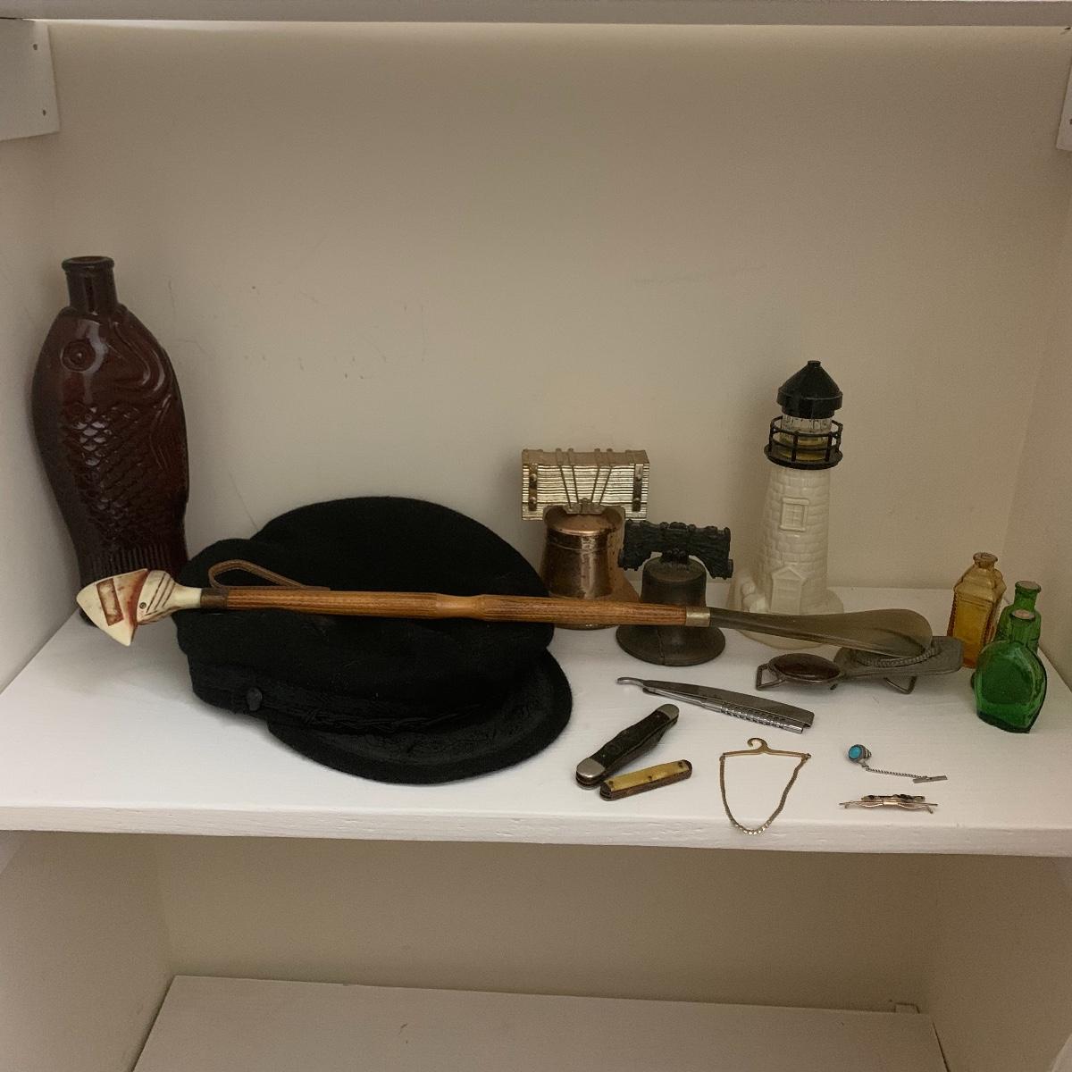 This is such a cool vintage lot! This includes a glass fish shaped bottle that measures 10”, two bottles of vintage cologne, three small vintage bottles, two pocket knifes, two belt buckles, three cuff links, a vintage folding comb, and a wood and ivory shoe horn that measures 21”. One of the bells is a heavy metal bell with a “crack” that is part of the design. The other bell is painted glass with a plastic handle, and os actually a cologne bottle with cologne in it. Shipping Available.