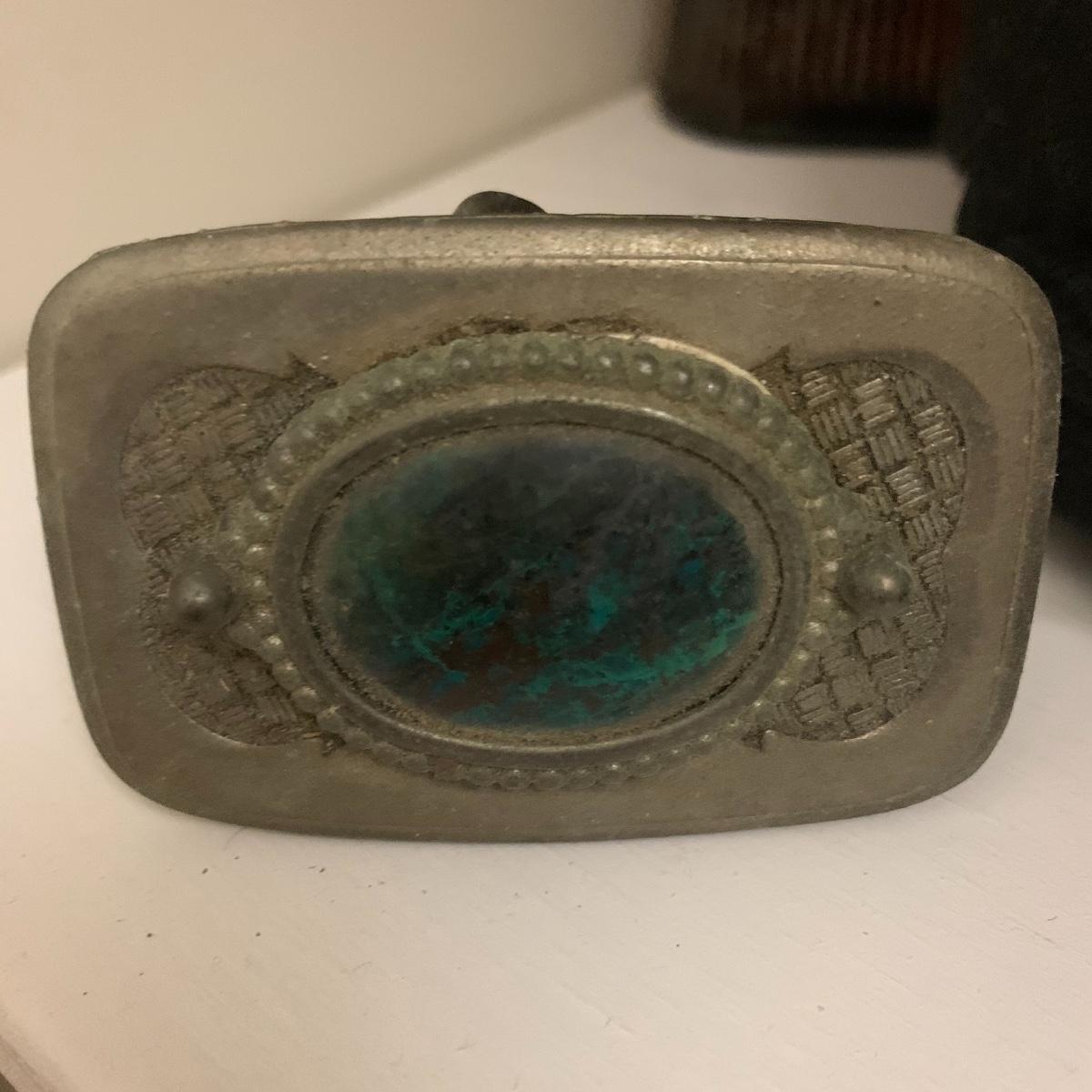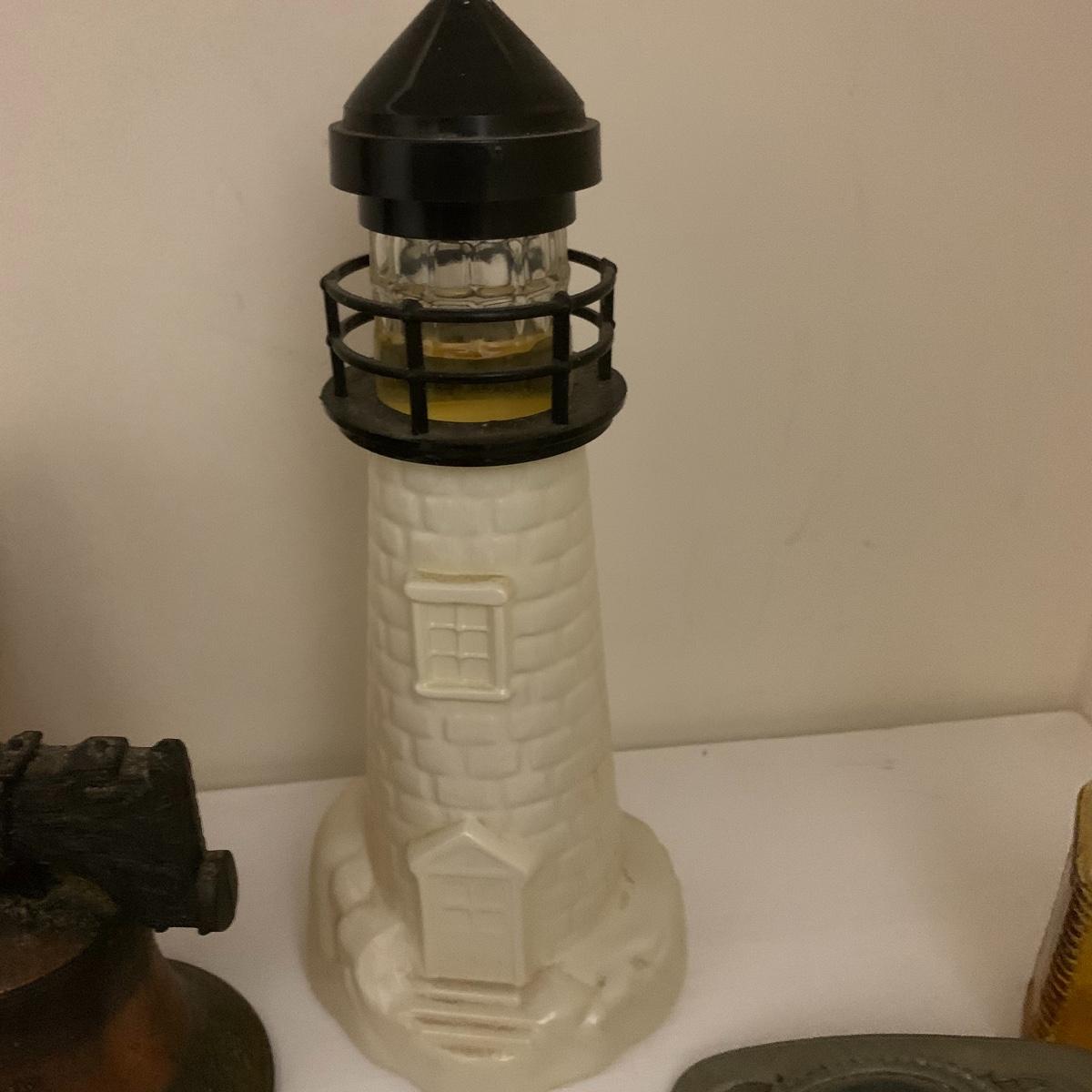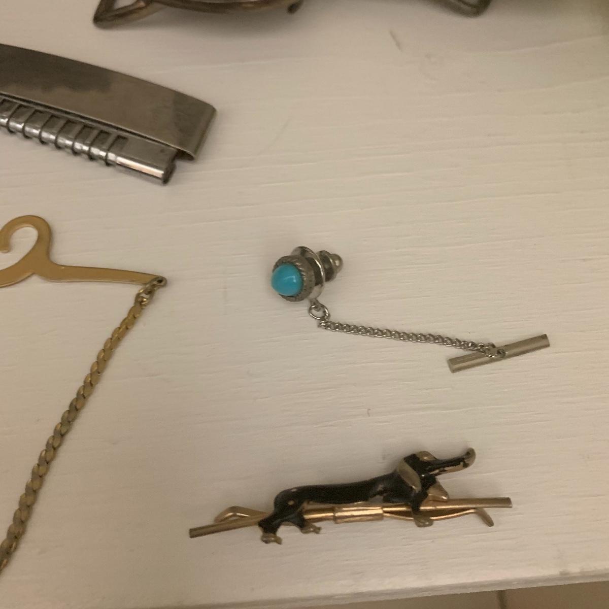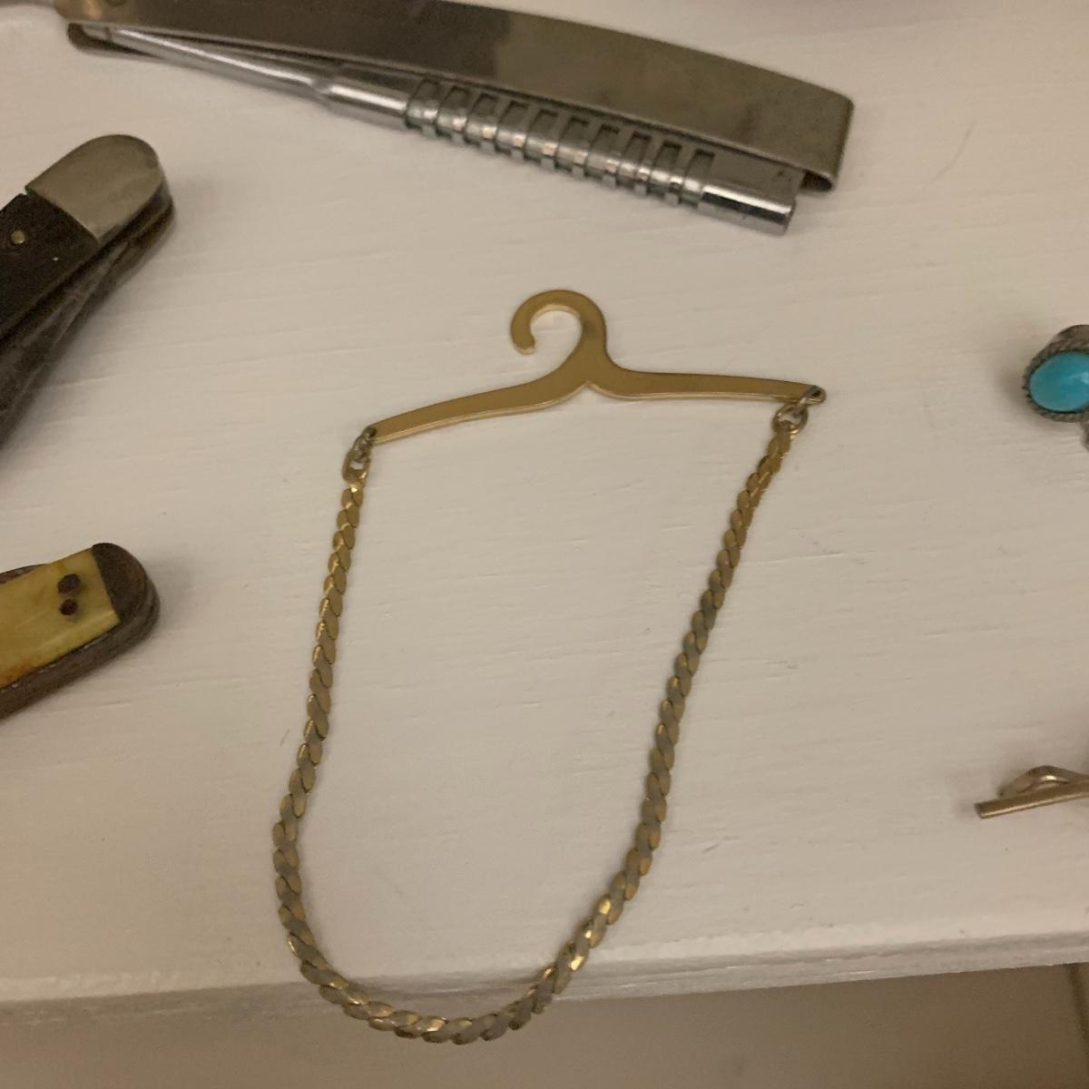 This is such a cool vintage lot! This includes a glass fish shaped bottle that measures 10”, two bottles of vintage cologne, three small vintage bottles, two pocket knifes, two belt buckles, three cuff links, a vintage folding comb, and a wood and ivory shoe horn that measures 21”. One of the bells is a heavy metal bell with a “crack” that is part of the design. The other bell is painted glass with a plastic handle, and os actually a cologne bottle with cologne in it. Shipping Available.