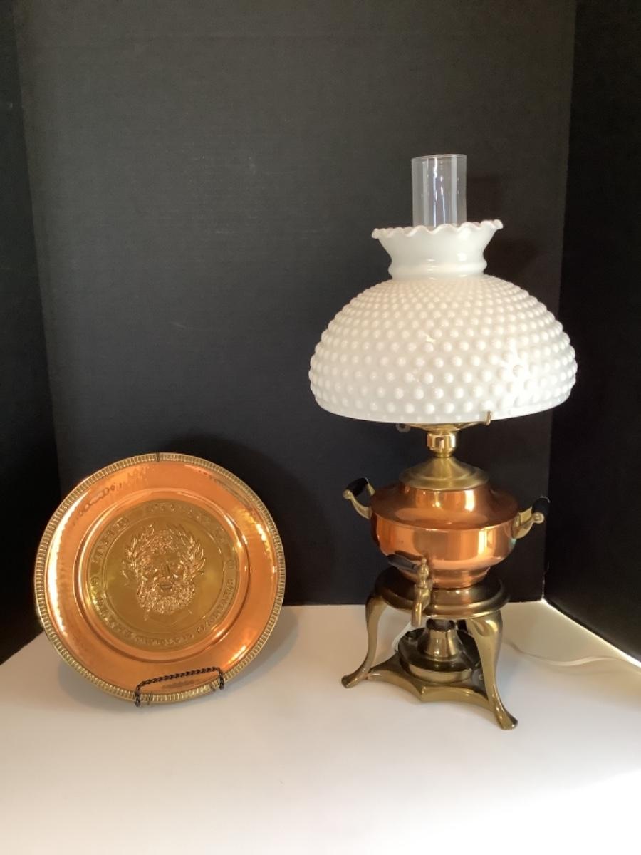 K. 853 Copper / Brass Samovour Lamp with Milkglass Shade & Copper / Brass Plate