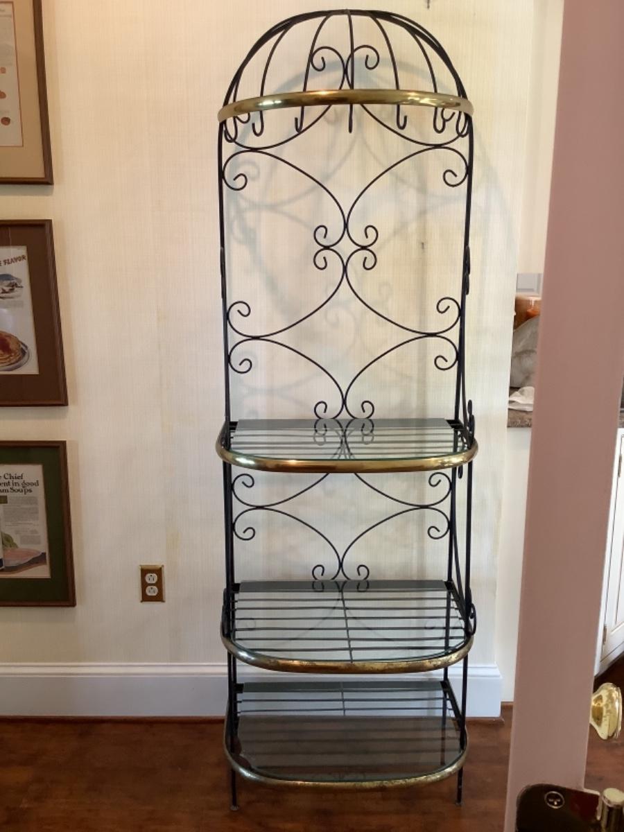 Black / Gold Metal Bakers Rack, has three shelves, & 7 Pan Hooks -