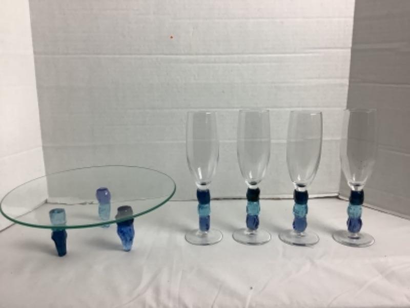 K - 907  Blue Glass Rock Stemware & Pedestal Serving Plate