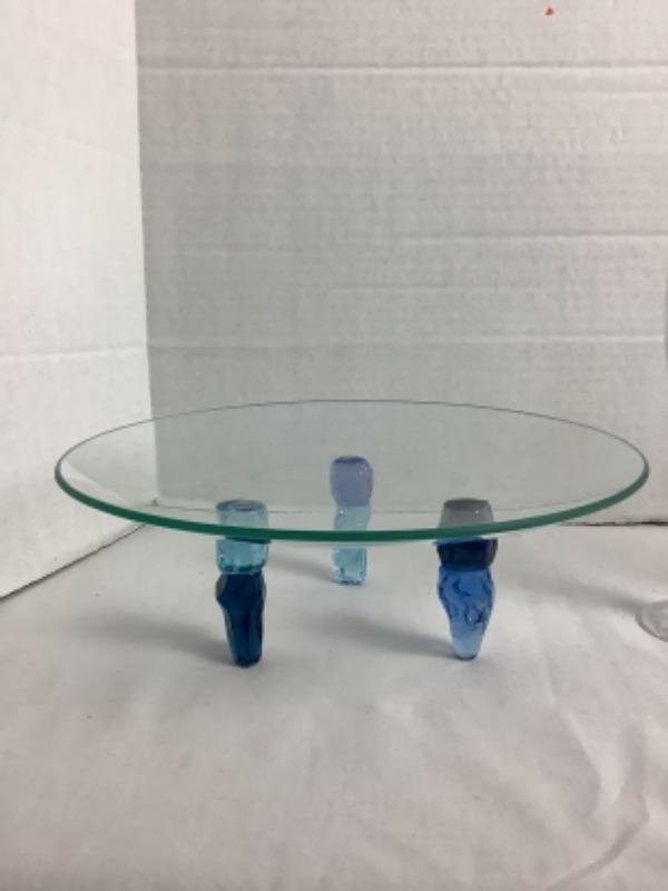 1 - Blue Glass Rock Pedestal Serving Plate, 10.25” Round x 3.5” Tall