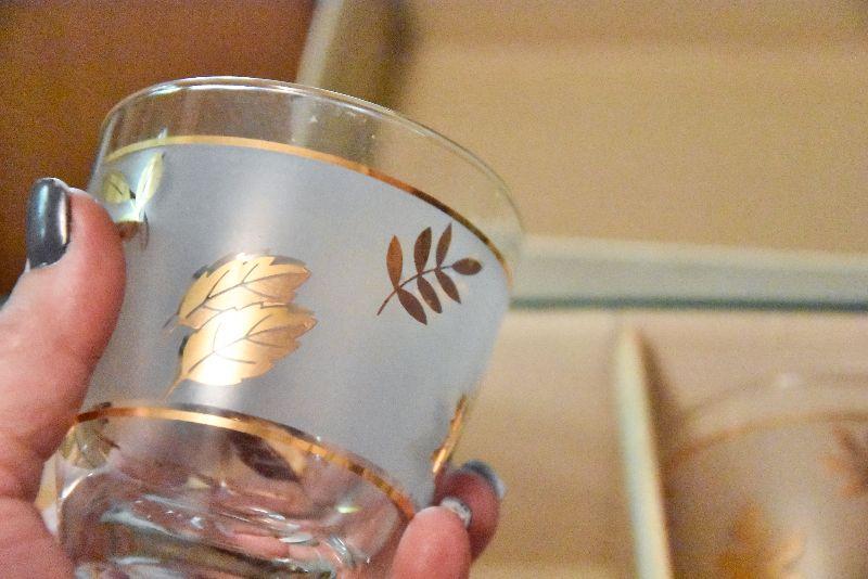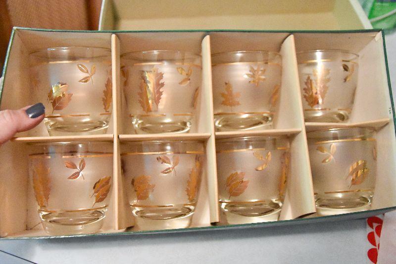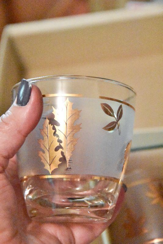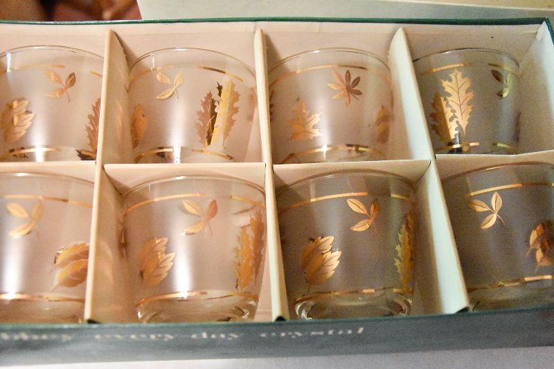 Still in box, etched glasses with gold leaves.