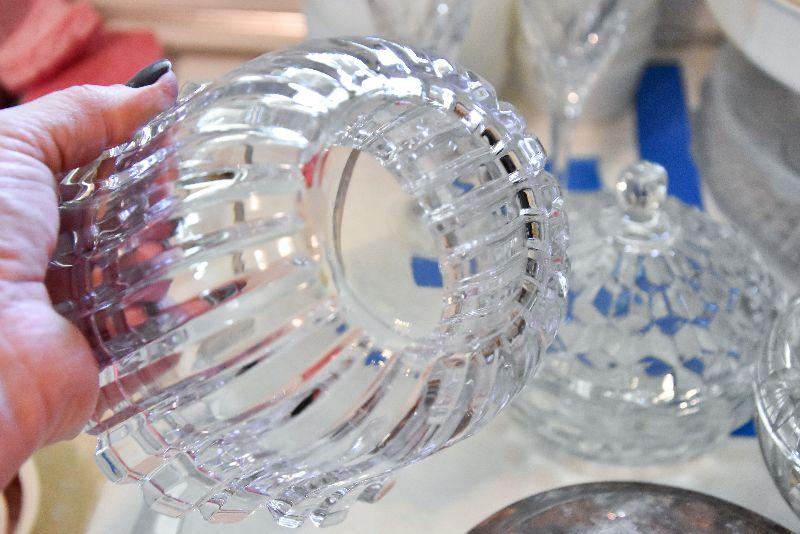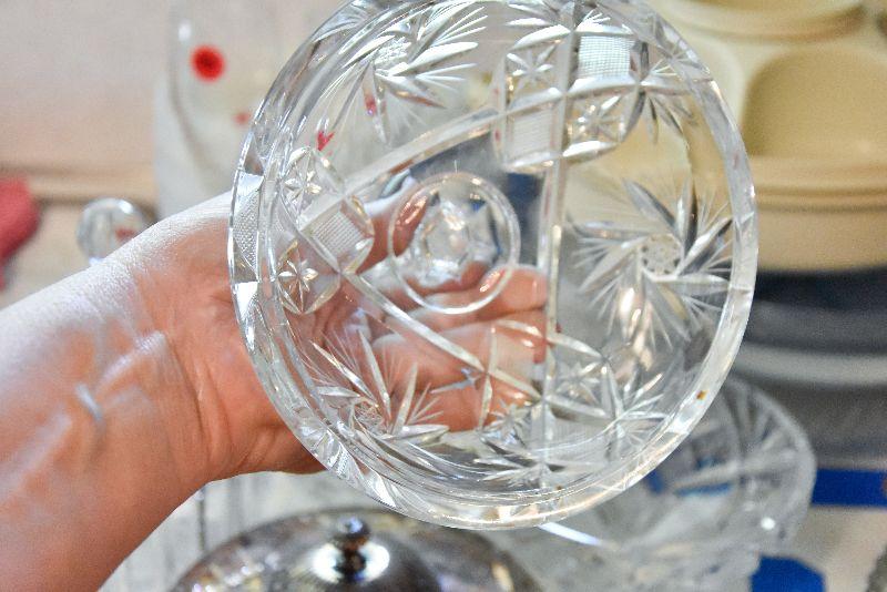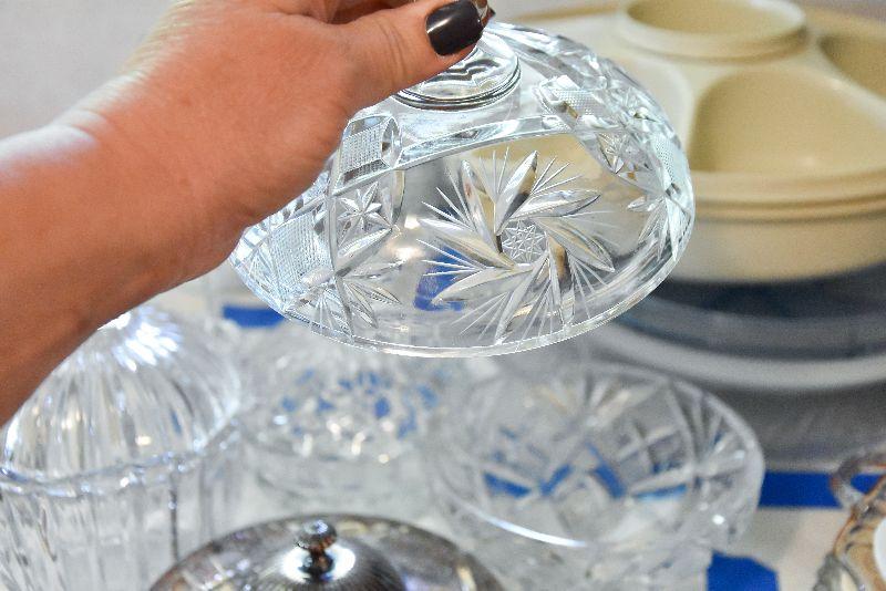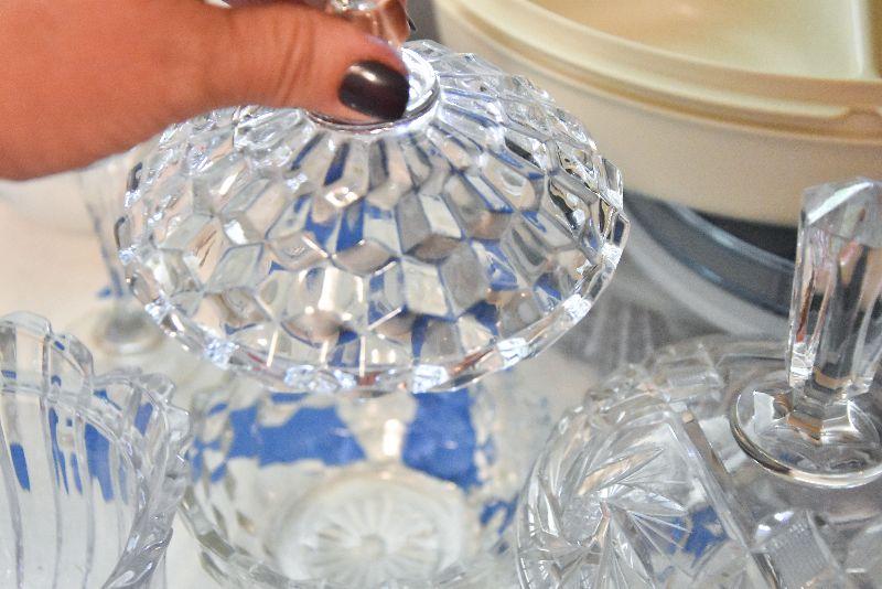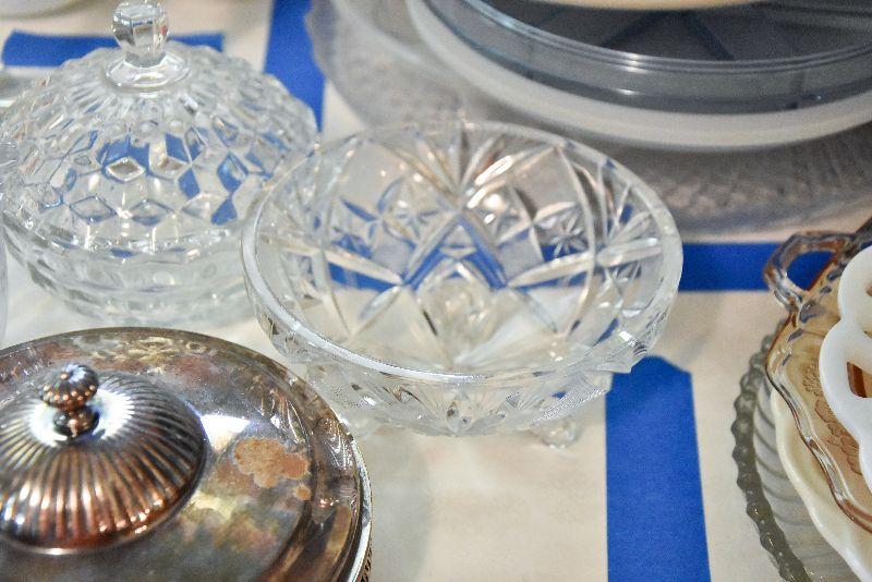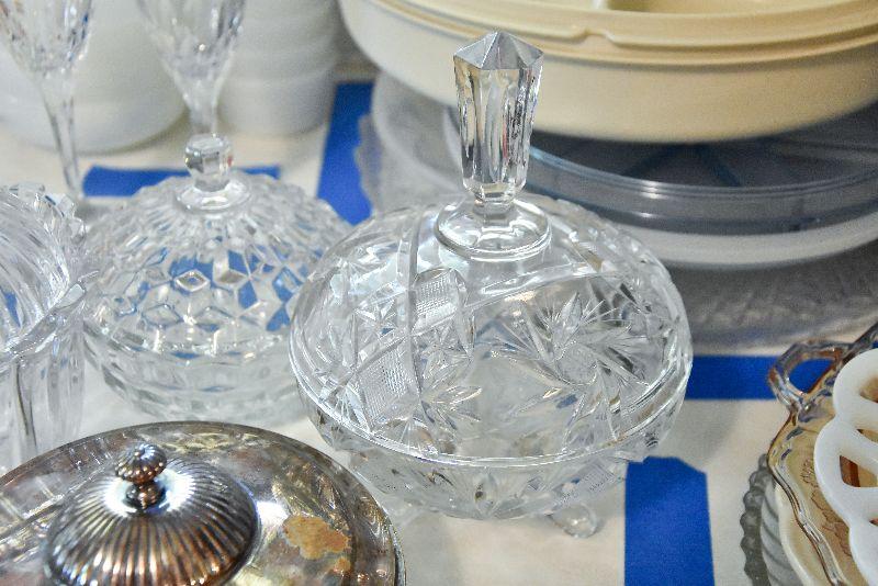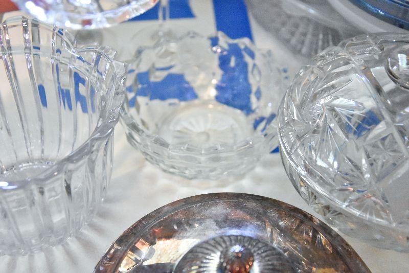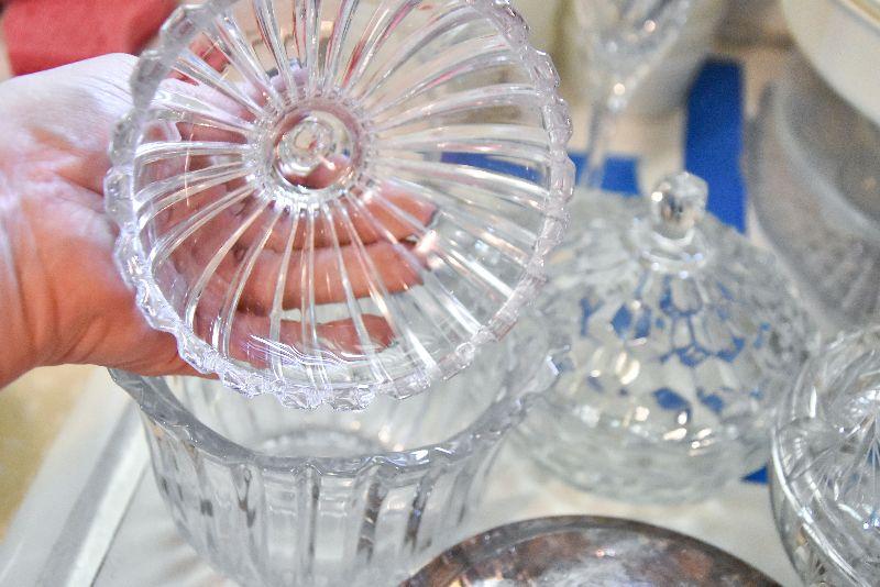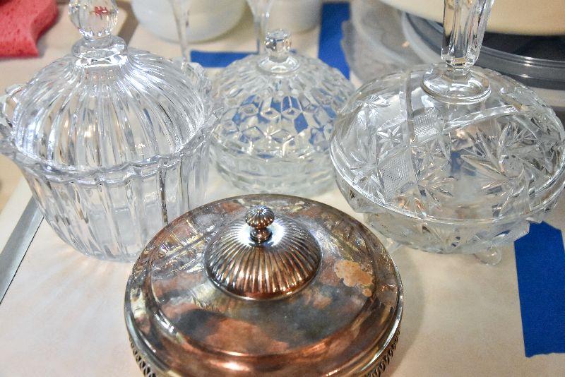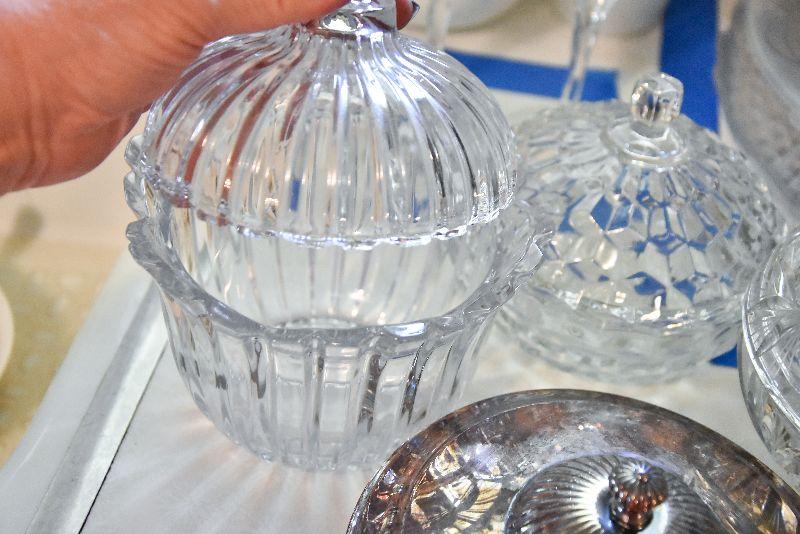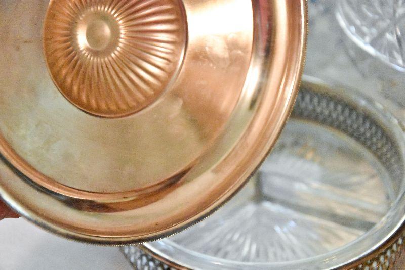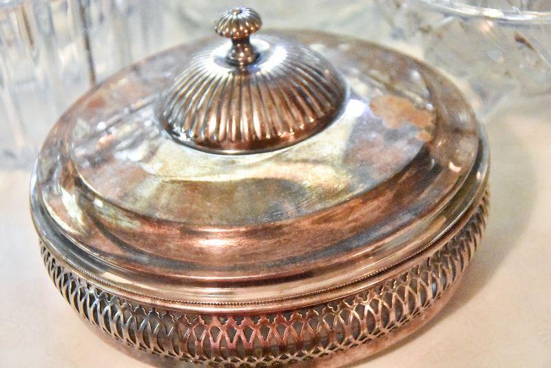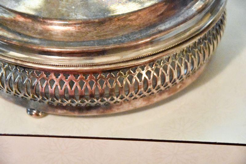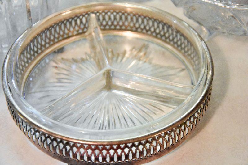 Simply elegant. Silver plated with separators, and three pressed glass beauties with lids. Bring box for moving.