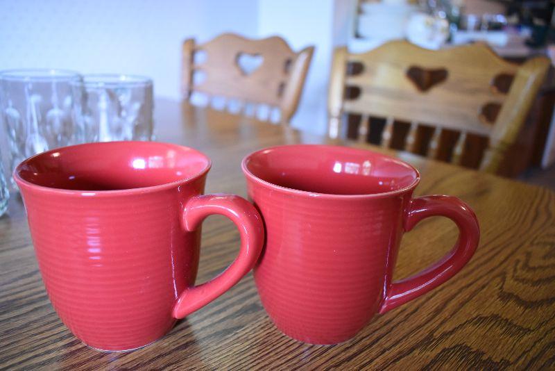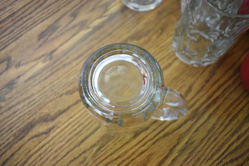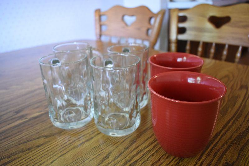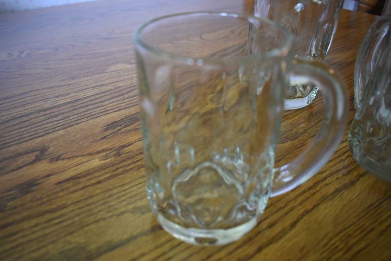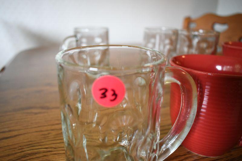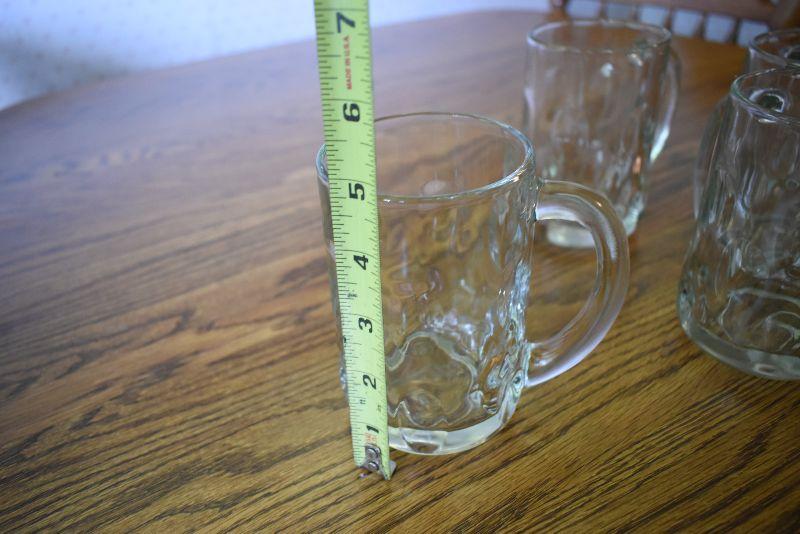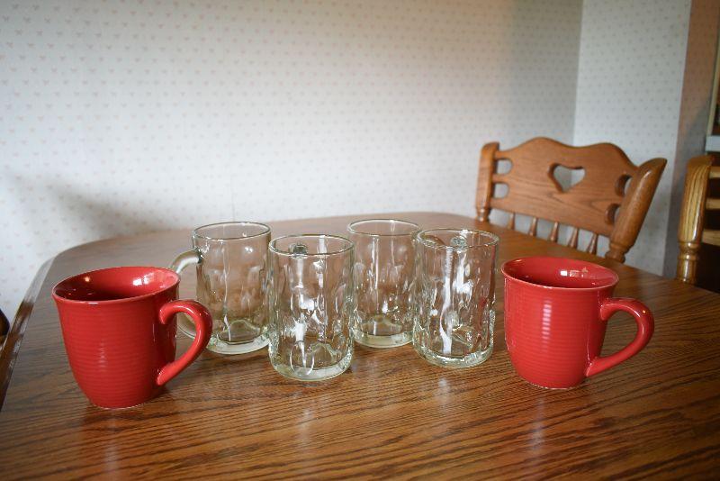 Four heavy glass, textured mugs, with handles, and two ceramic mugs. No chips.