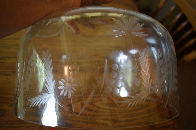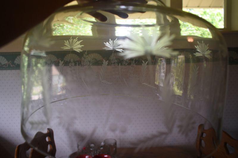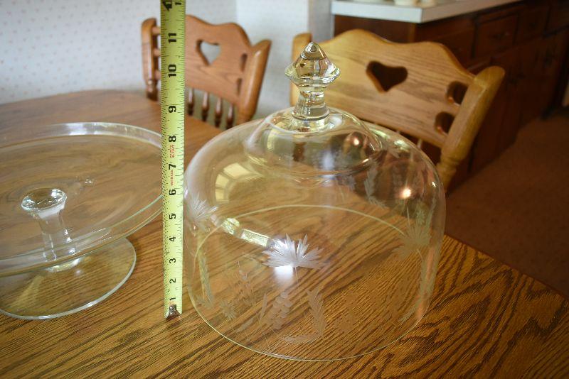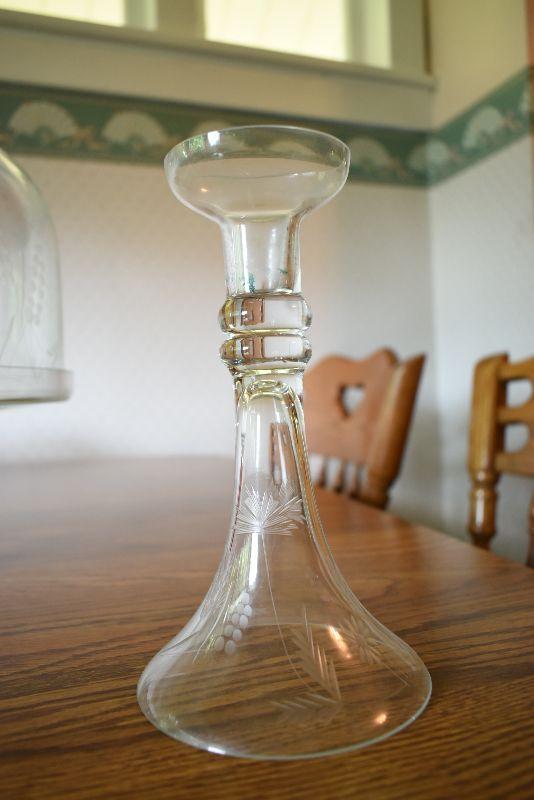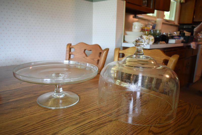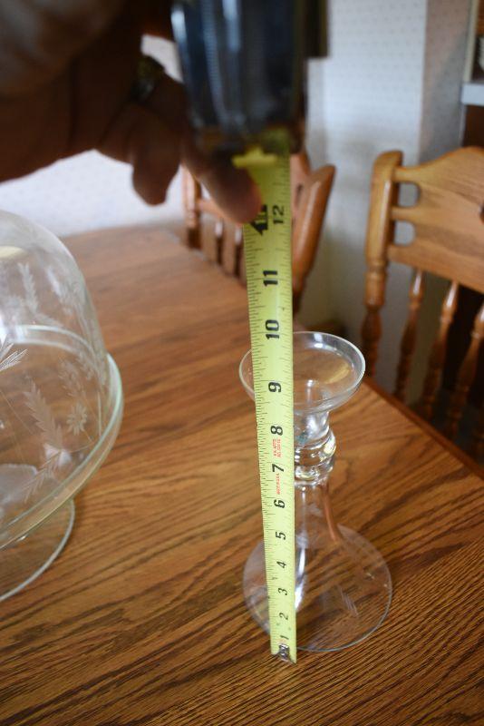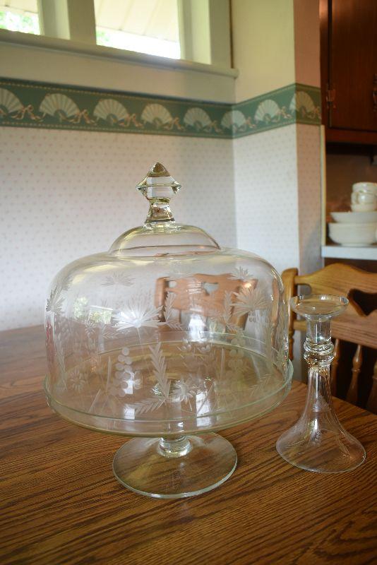 Glass pedestal cake stand with etched glass dome lid. Also a glass candle stick. No chips.