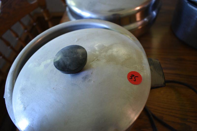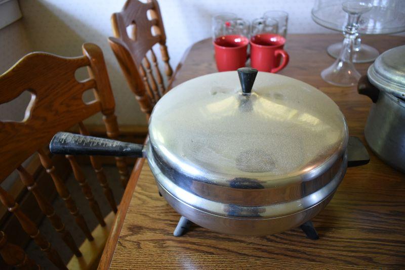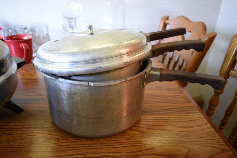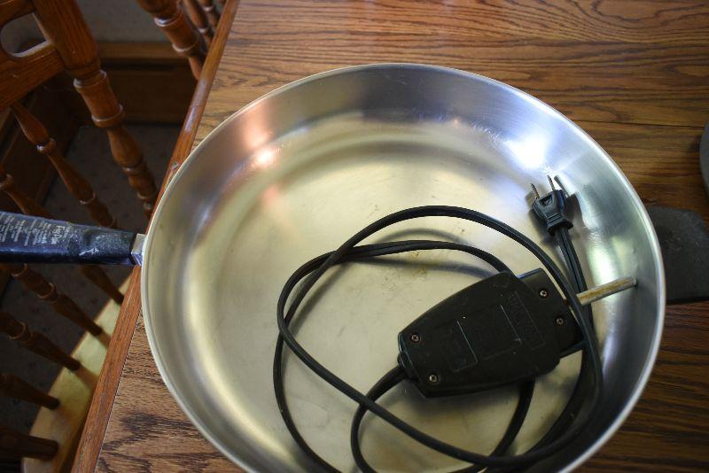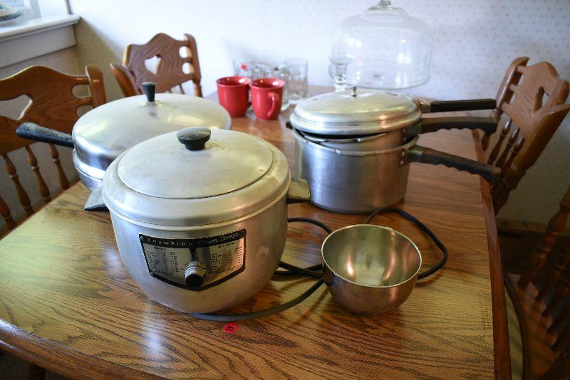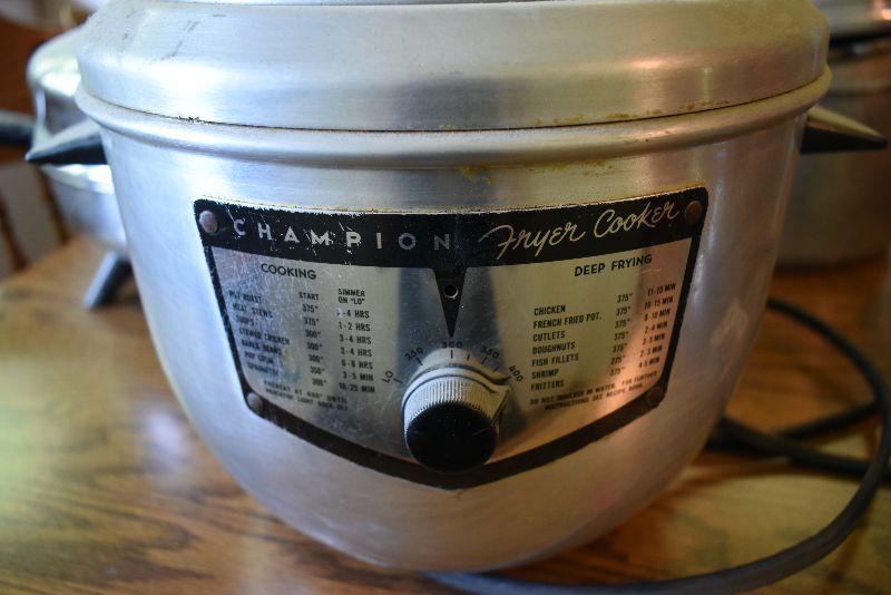 Pressure cooker, Champion electric deep fryer, and a Farberware electric frying pan. Untested.