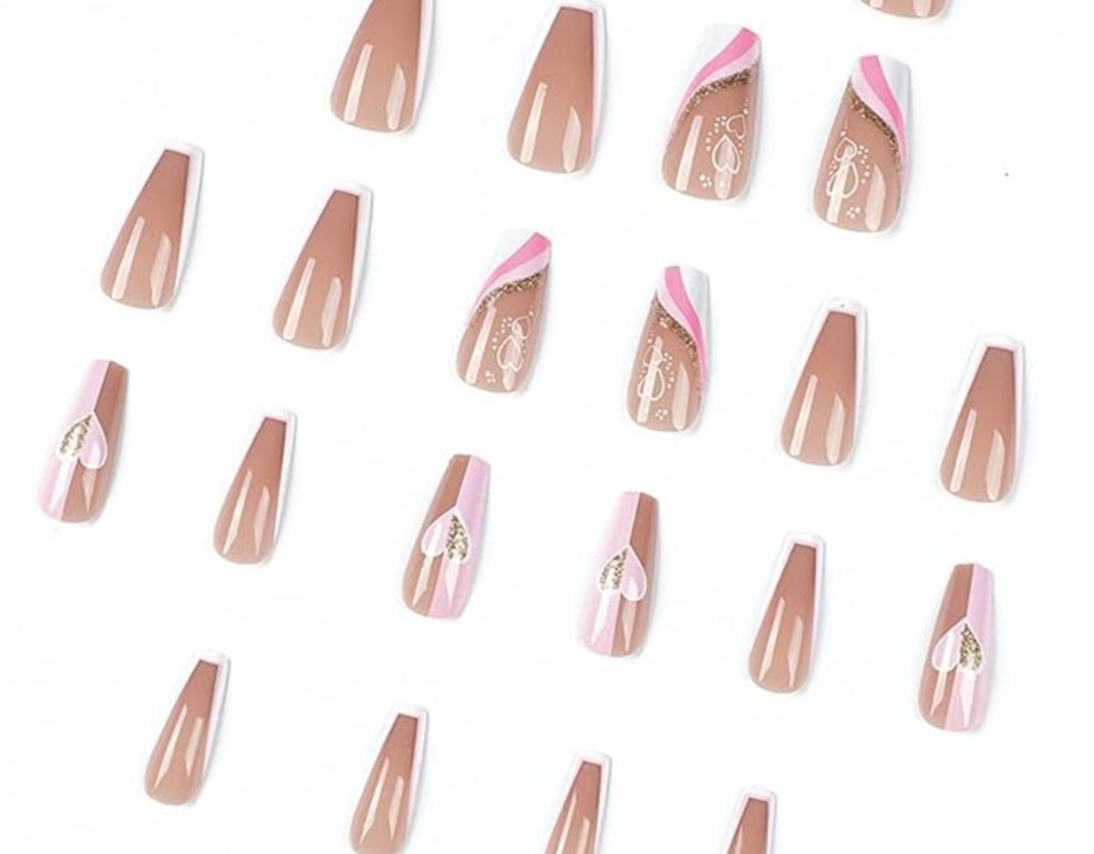 K - Press on Nails Medium Heart Coffin Acrylic Nails Glitter Full Cover Stick on Nails White French Tips Stick on Nails with Designs Artificial Nails Valentines Day Nail Decorations for Women Girls