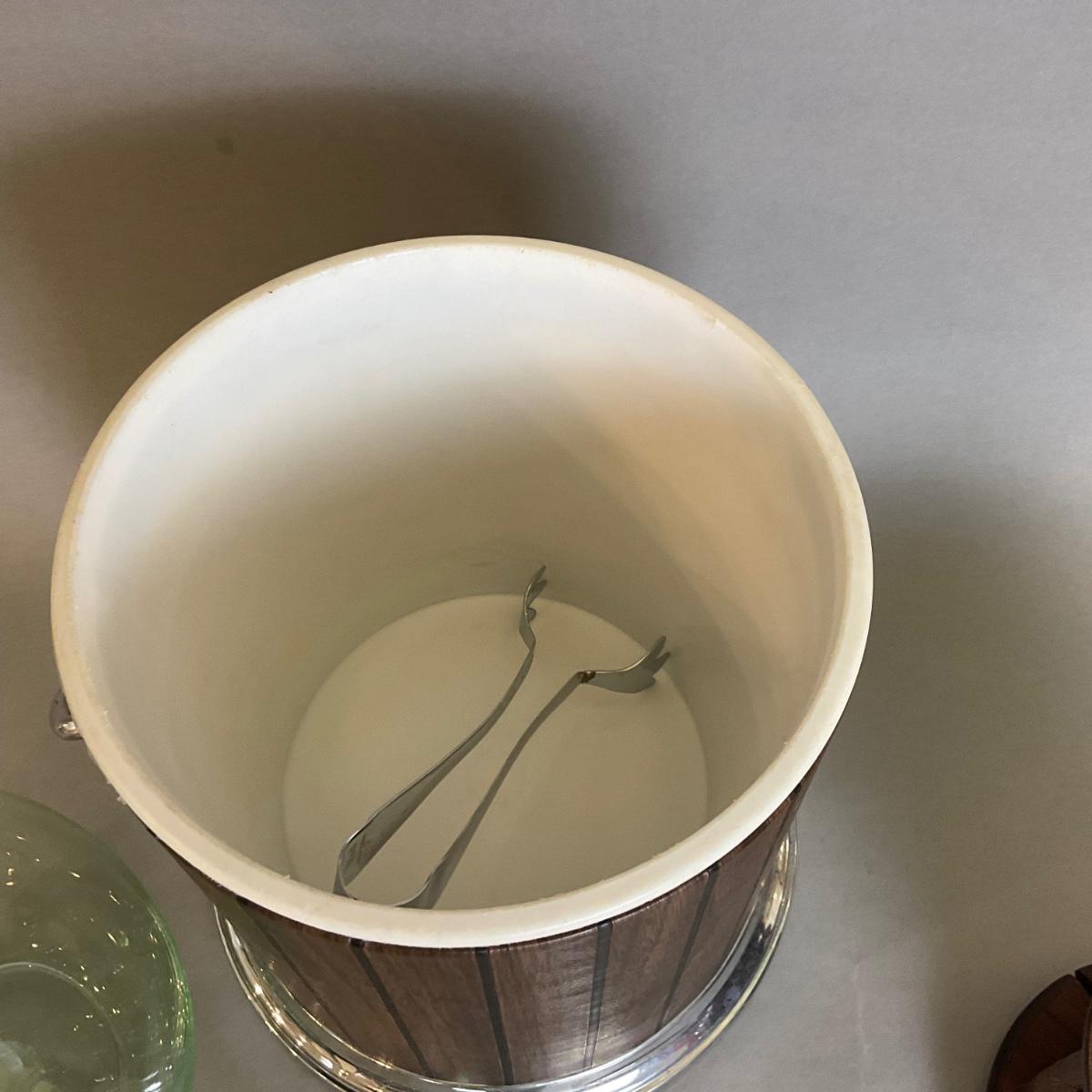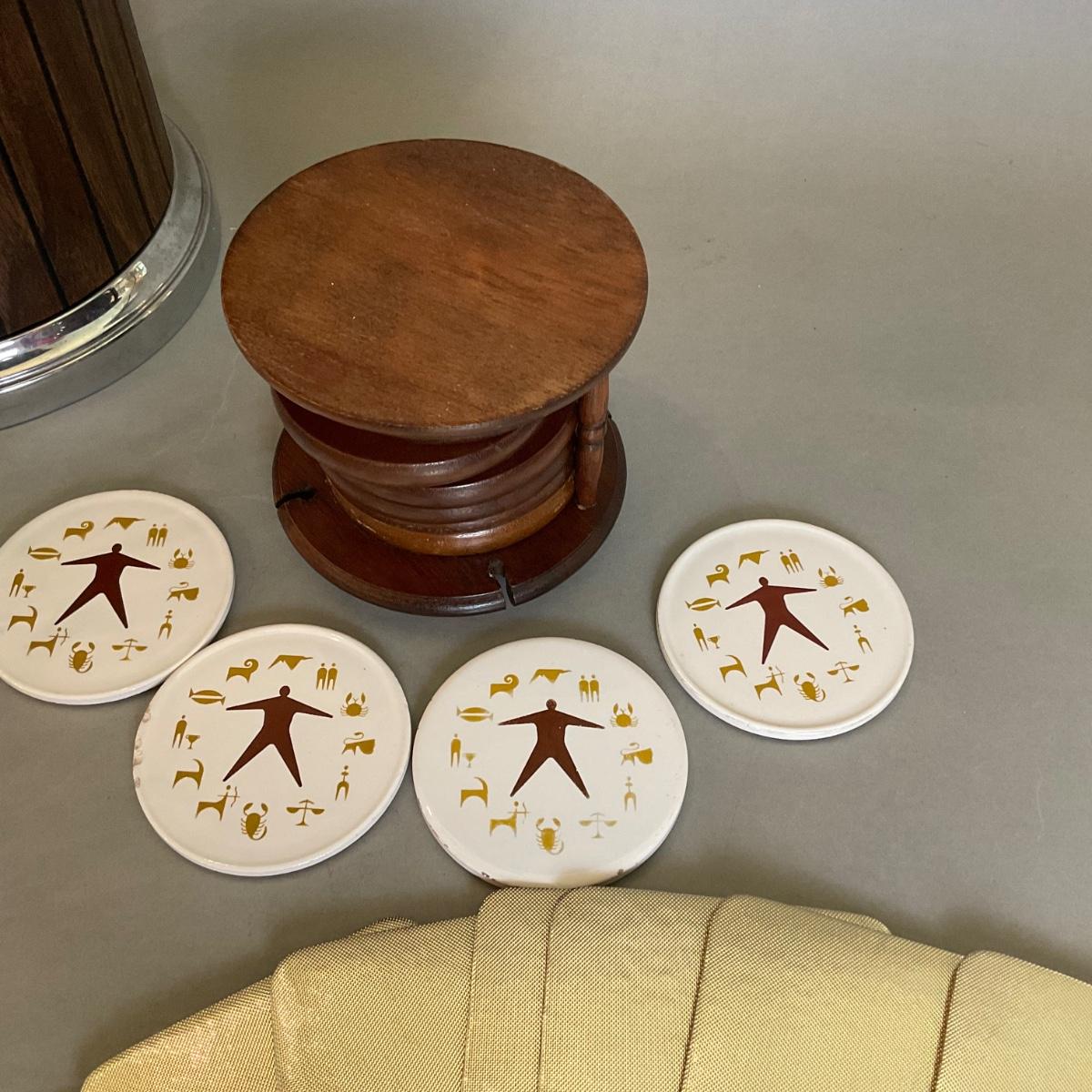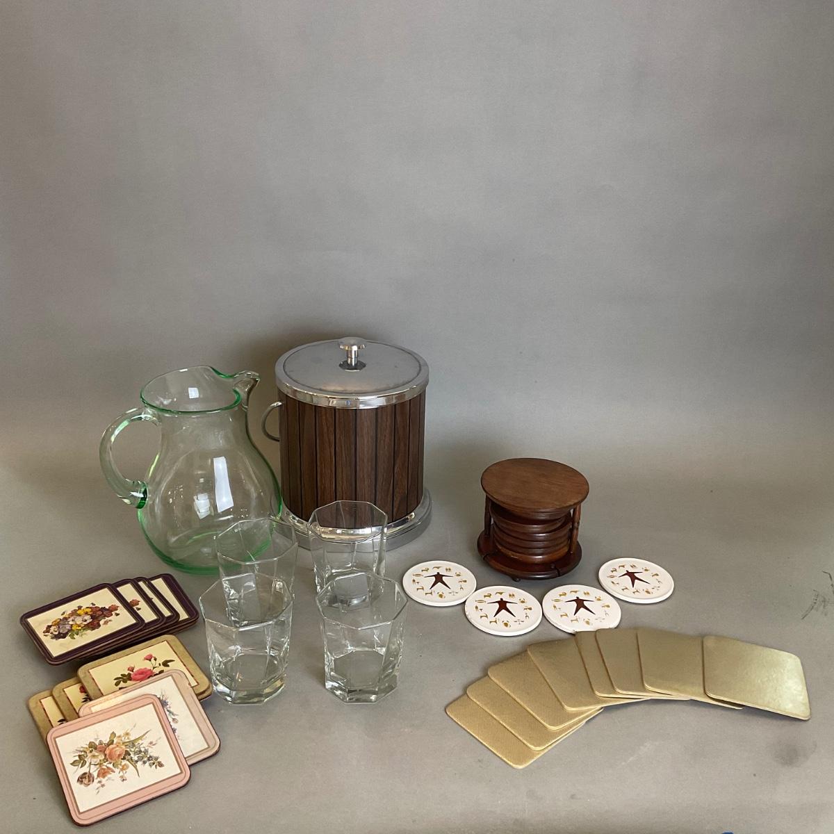 Comes with various types of floral coaster designs, tall ice bucket and tongs. Large glass pitcher, and 4 small geometrical glasses