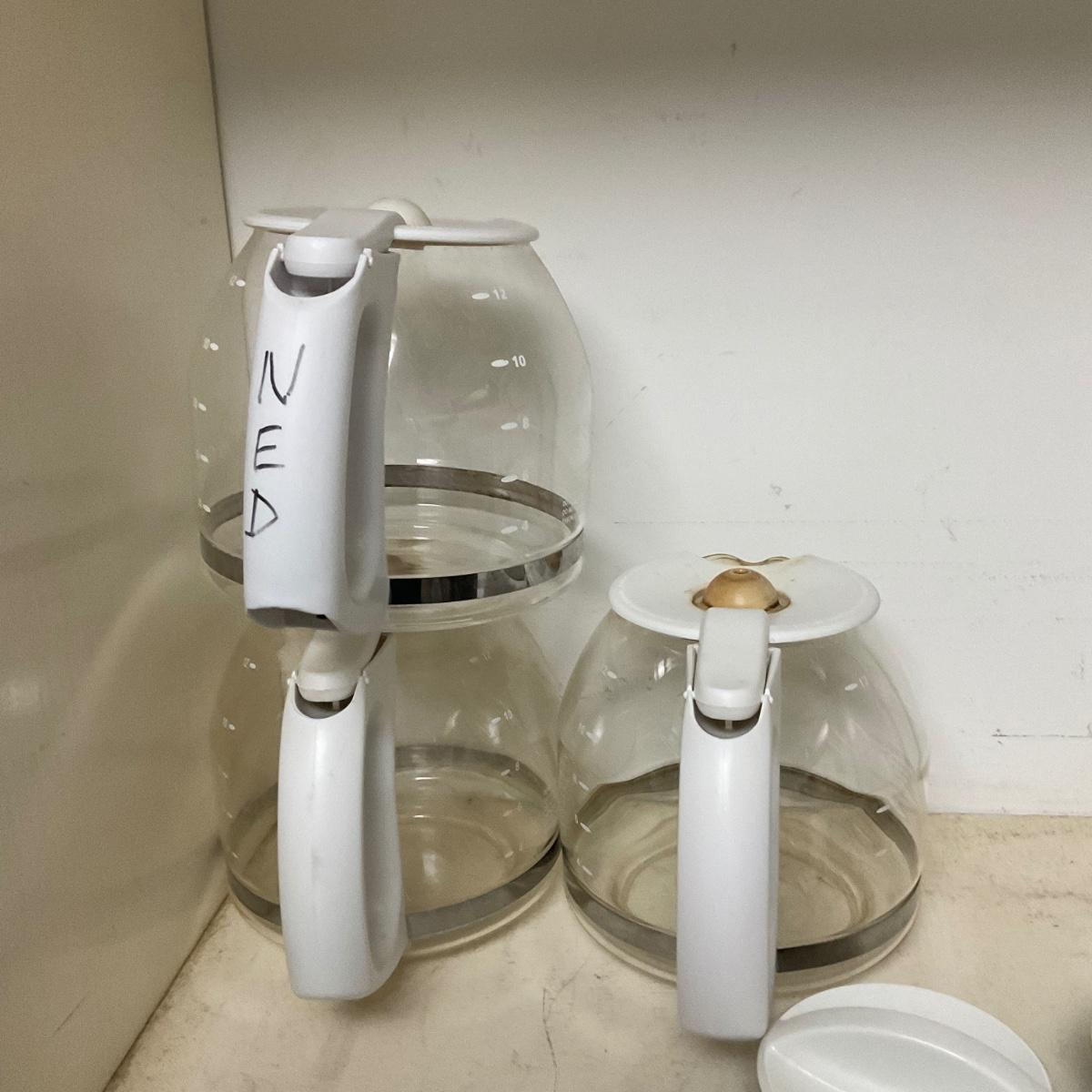 Comes with a Mr. Coffee single pot coffee maker, and a Krups dual pot coffee maker with 3 extra glass pots