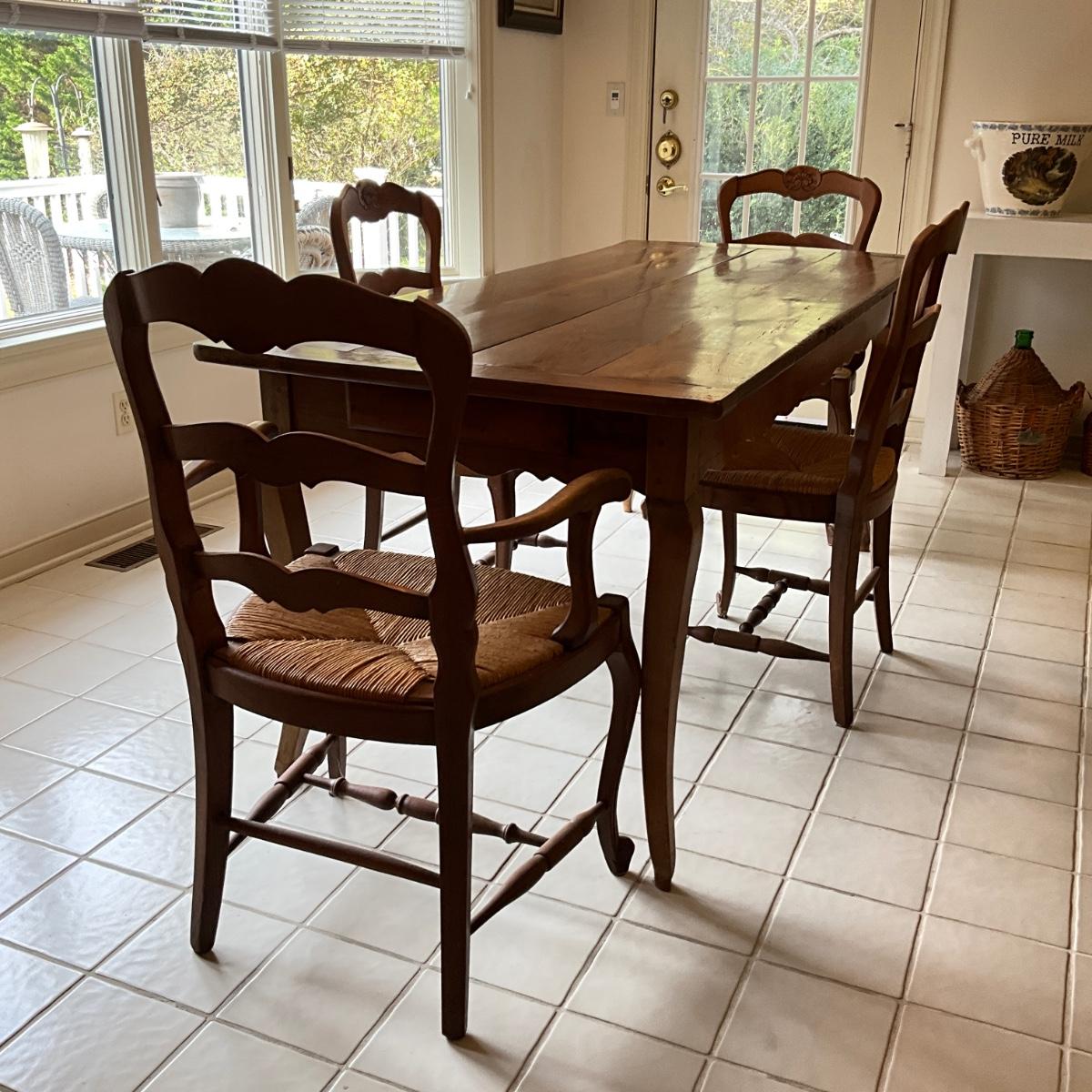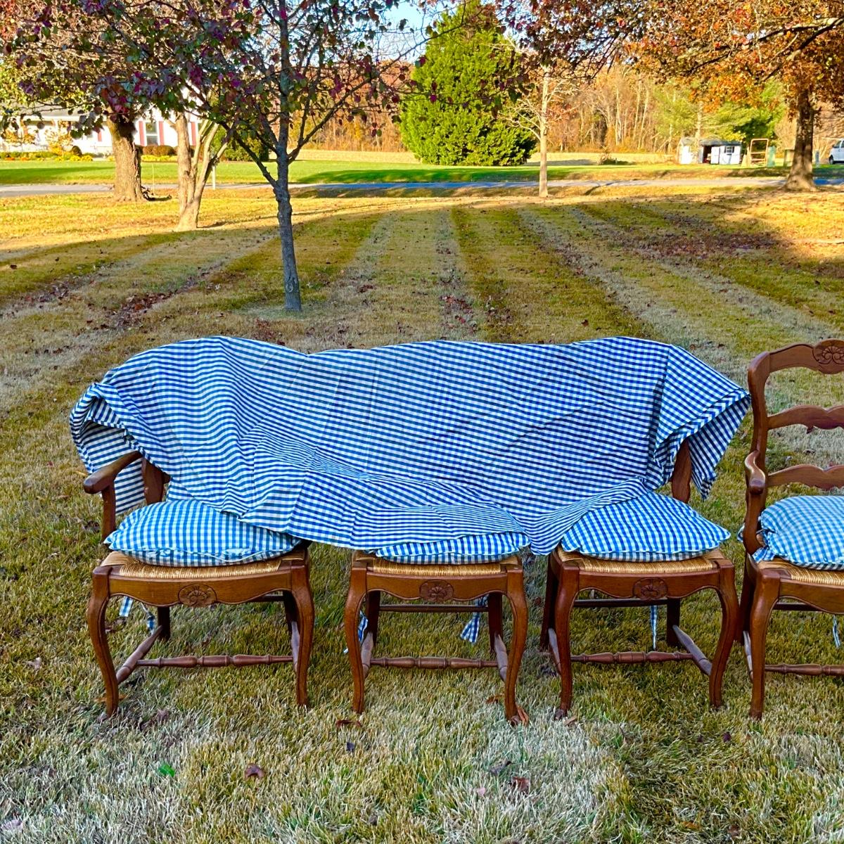 Two arm chairs, two side chairs , comes with blue and white pattern seat cushions. Also with blue and white same pattern round tablecloth. Pillow seat, cushions are down filled and show sign of wear and fading.