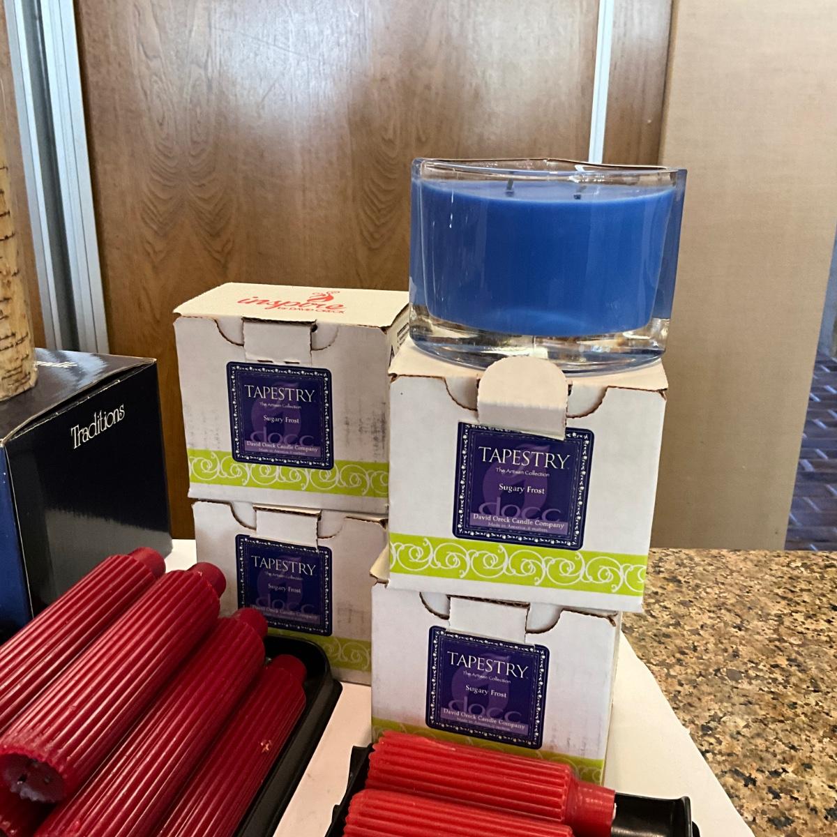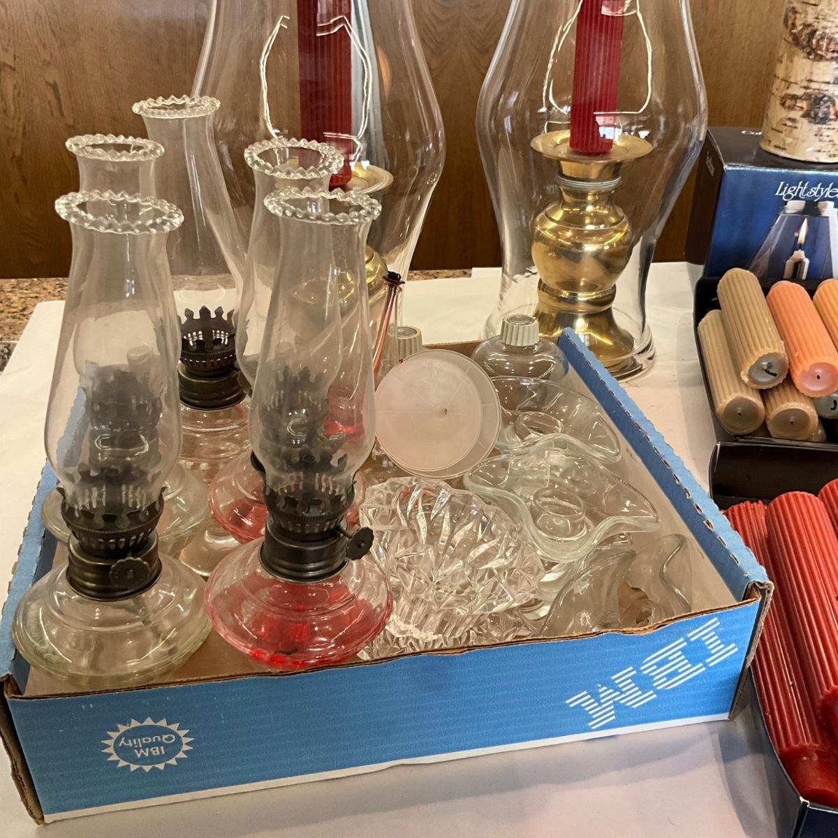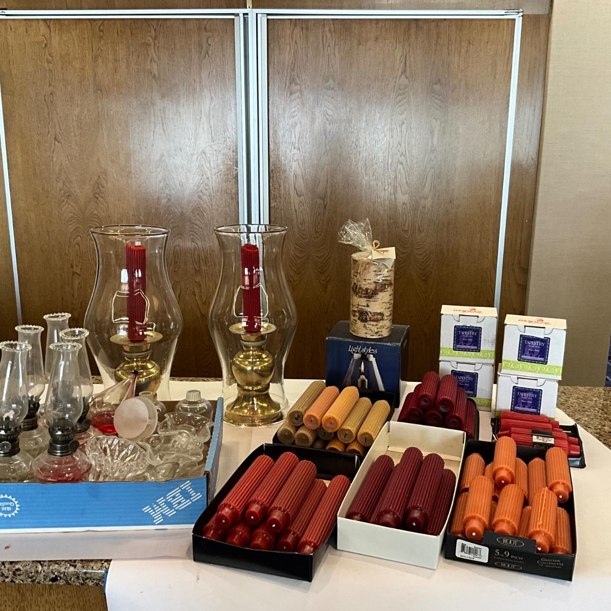 Various small oil lamps , and large selection of ROOT Candles some have been burned, small votives are new in box