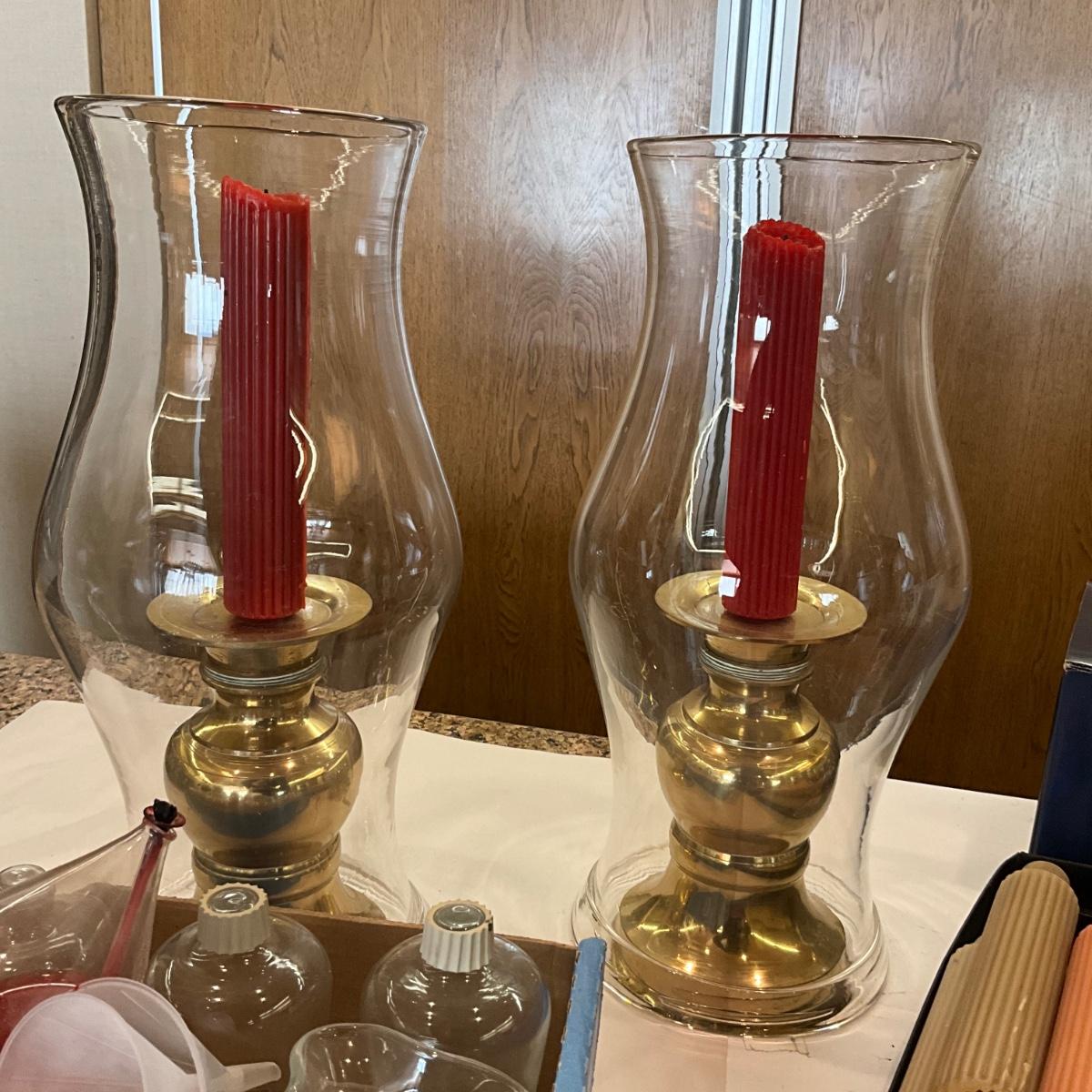 K1047 Lot of Brass Candlesticks with Hurricane Globes and ROOT Candles