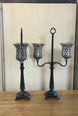 These double-arm candelabras both stand 26" tall x 5.5" deep and are 16" wide. The condition is very nice.