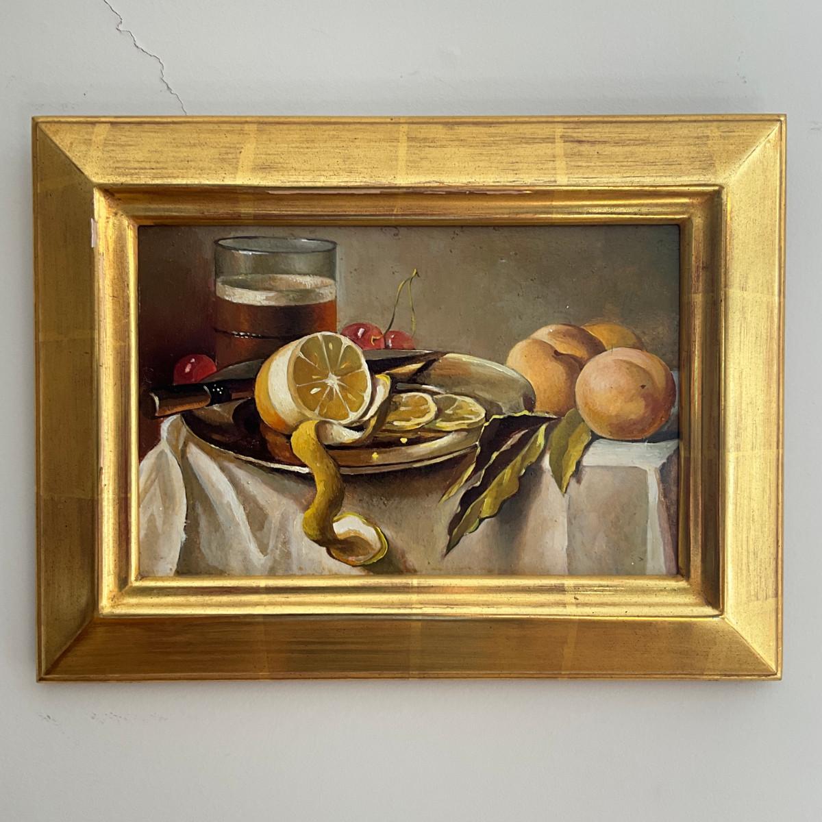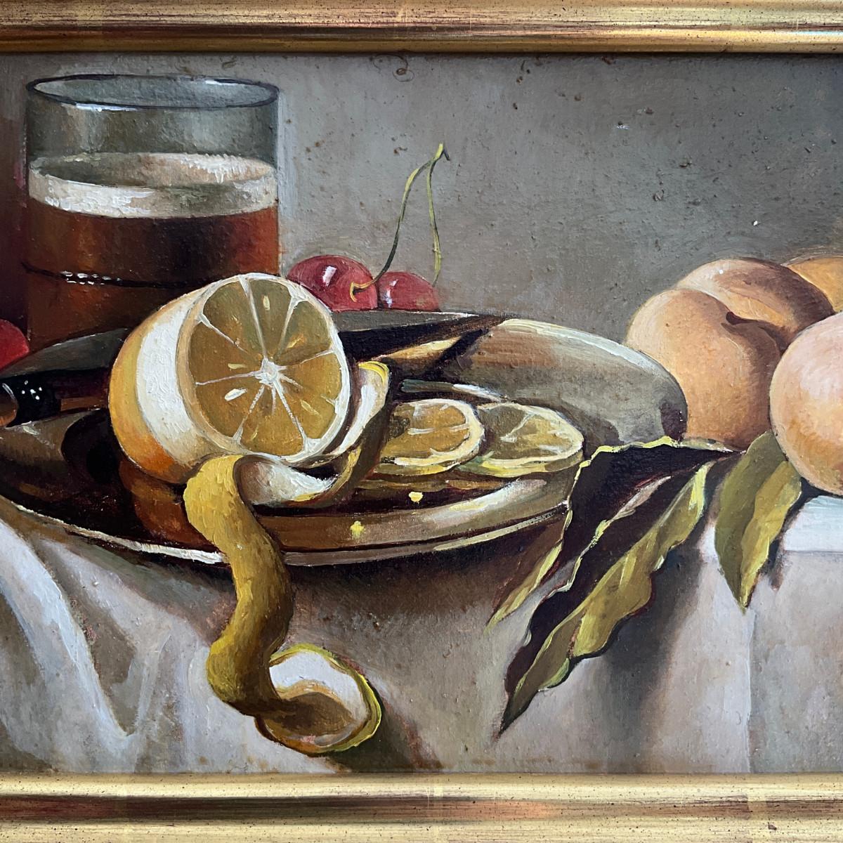 K115 Original Oil Still-Life Depicting Cherries, Peaches, and Lemon