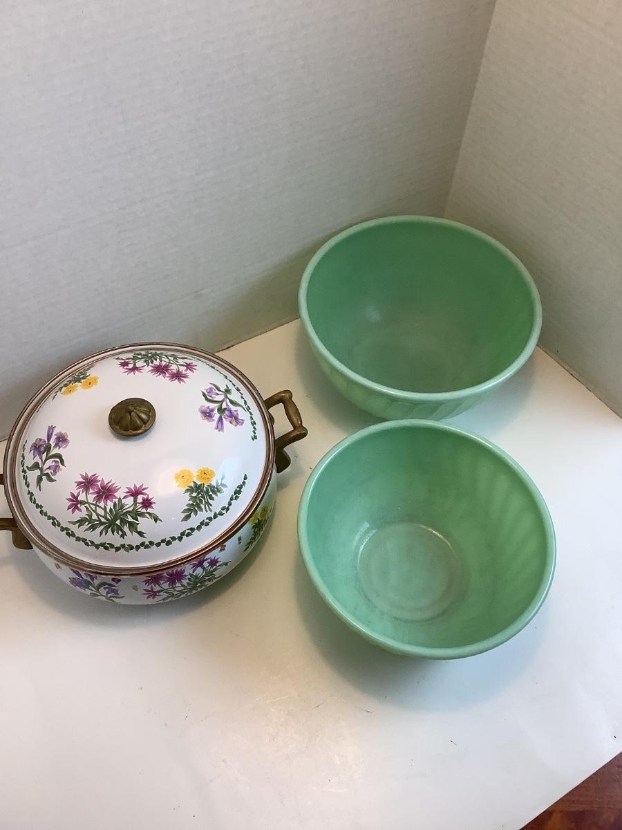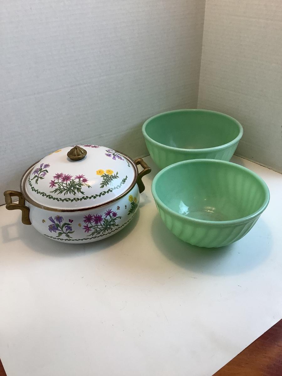 Jadite bowls are 8” & 9” with enamelware pot in good condition
