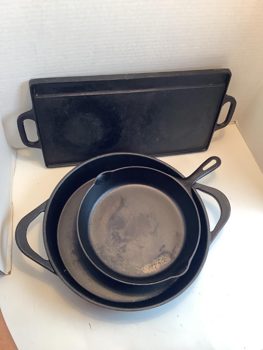 The smaller skillet is unmarked and measures 10.5” round and the griddle is by old mountain