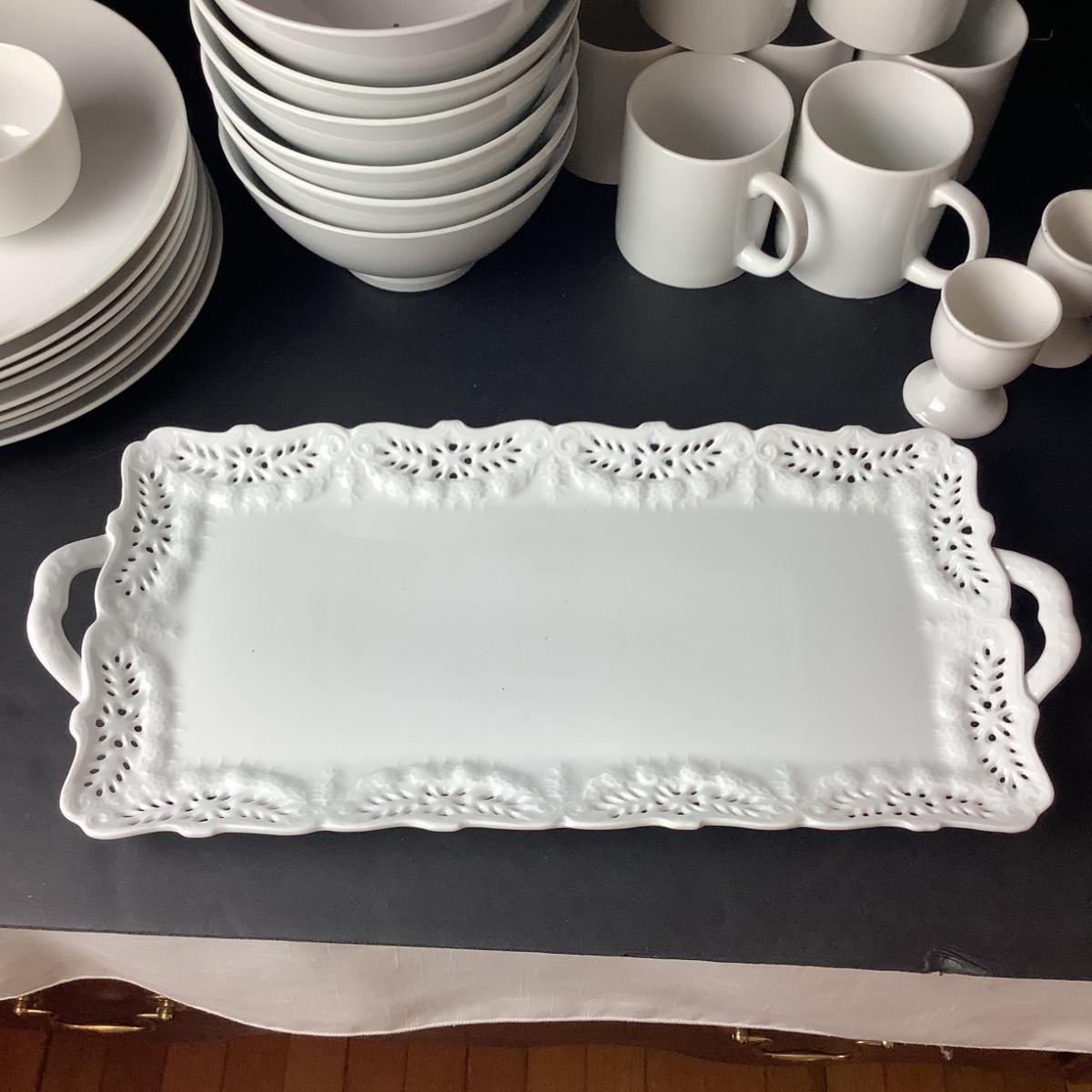 8 snack plates, 8 mugs, 2 sake cups, 2 egg coddlers rectangle reticulated lace pattern platter