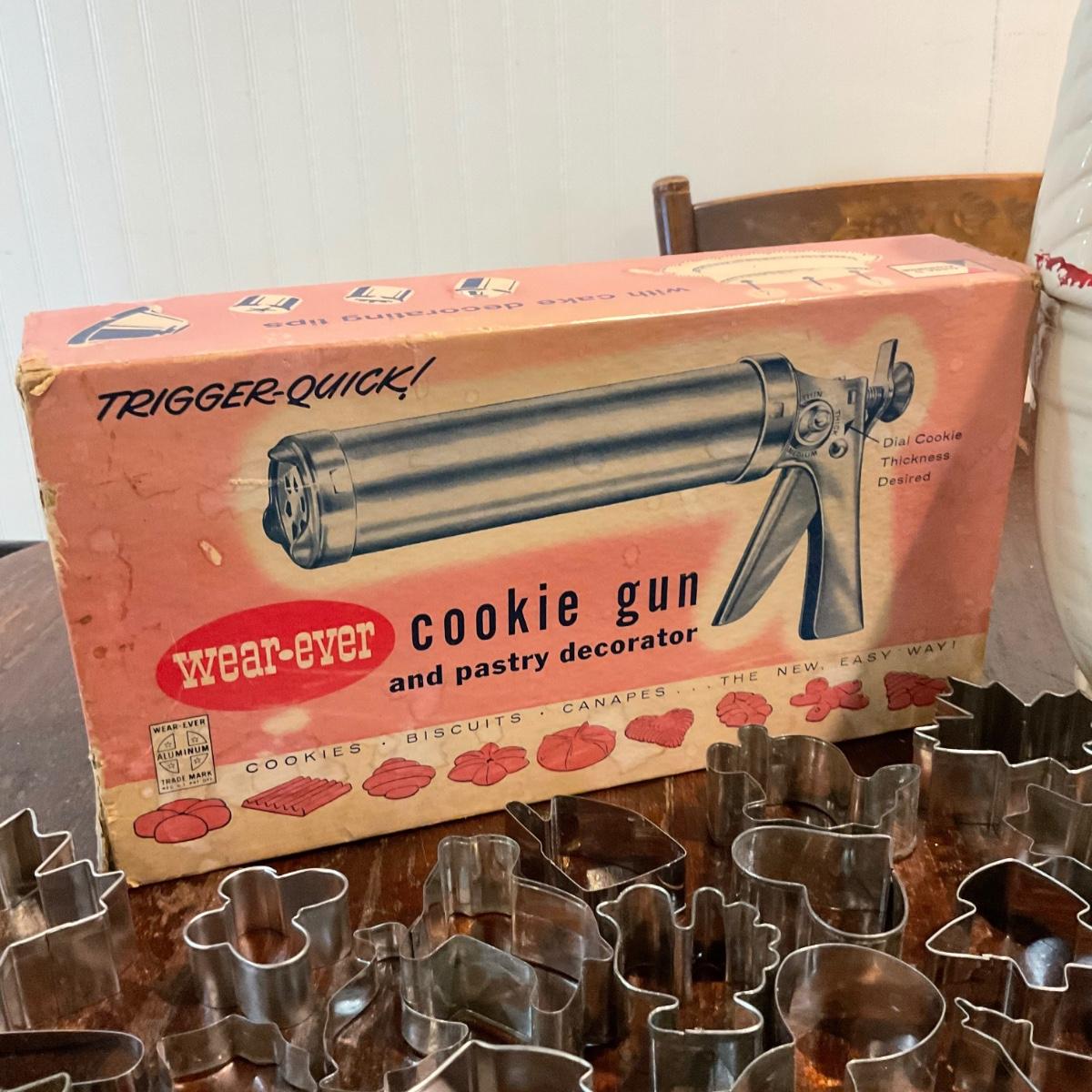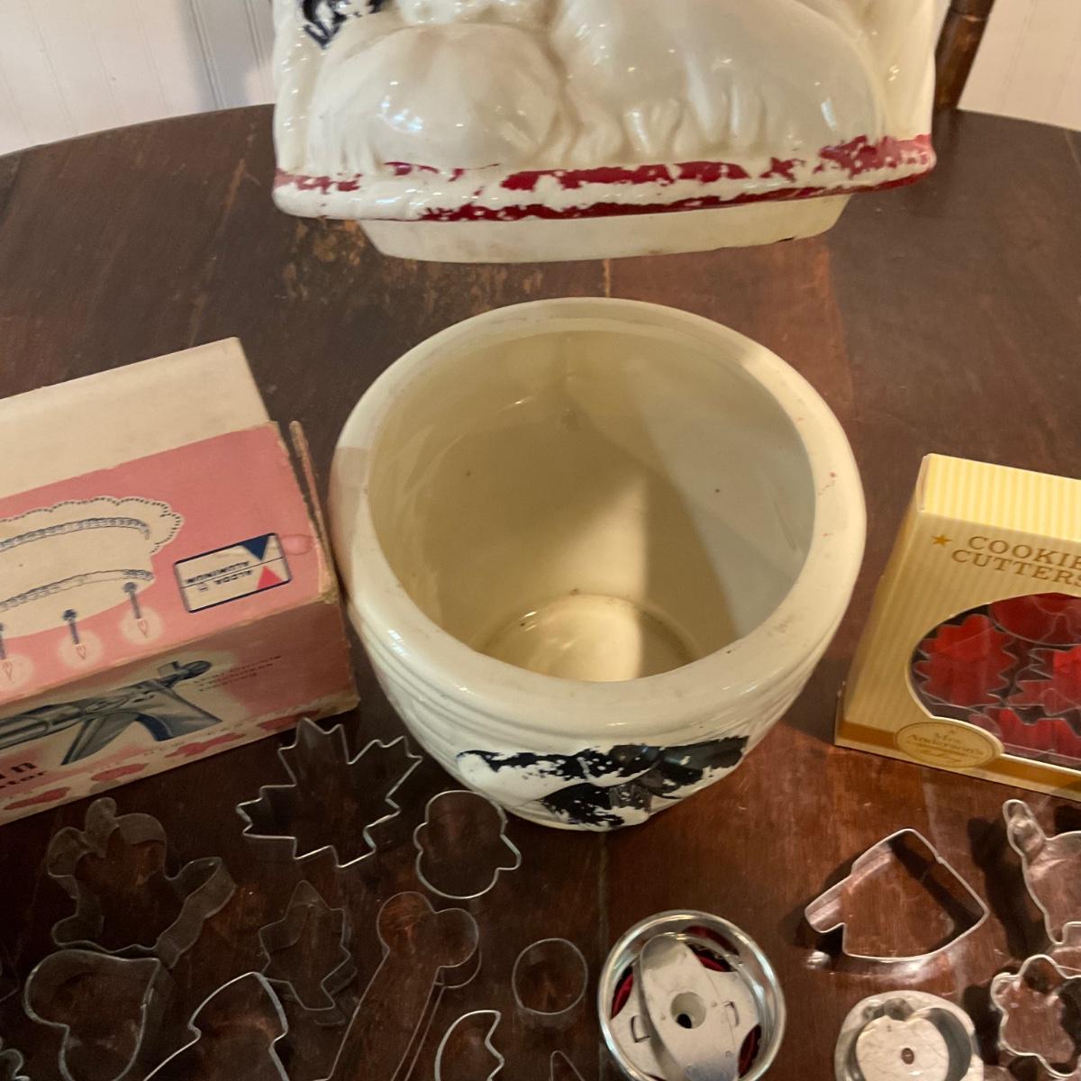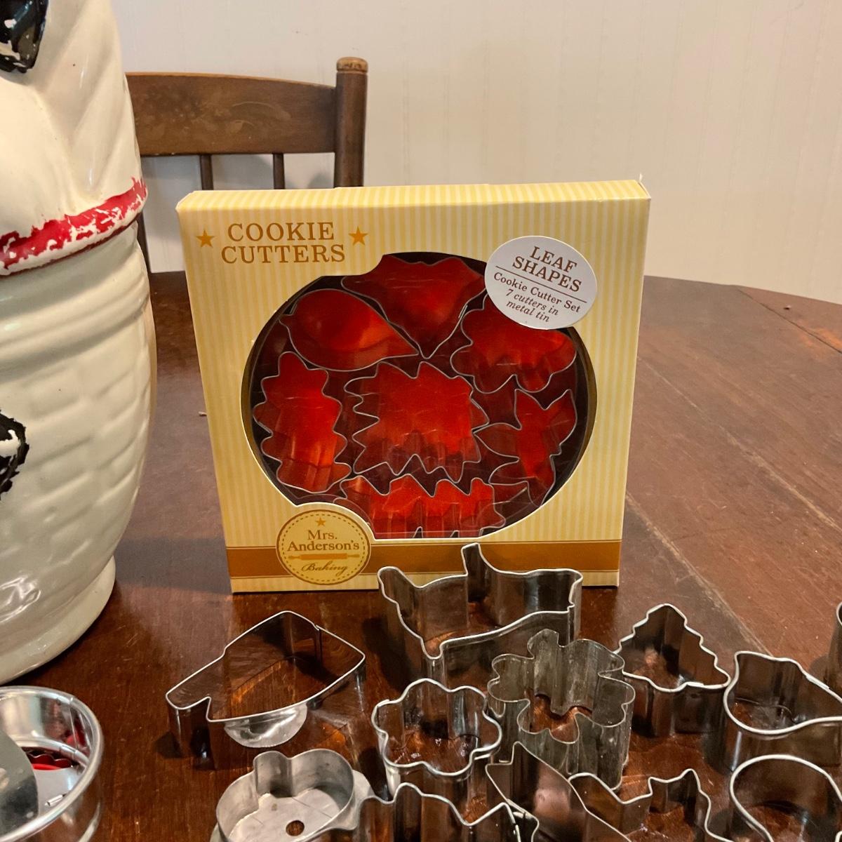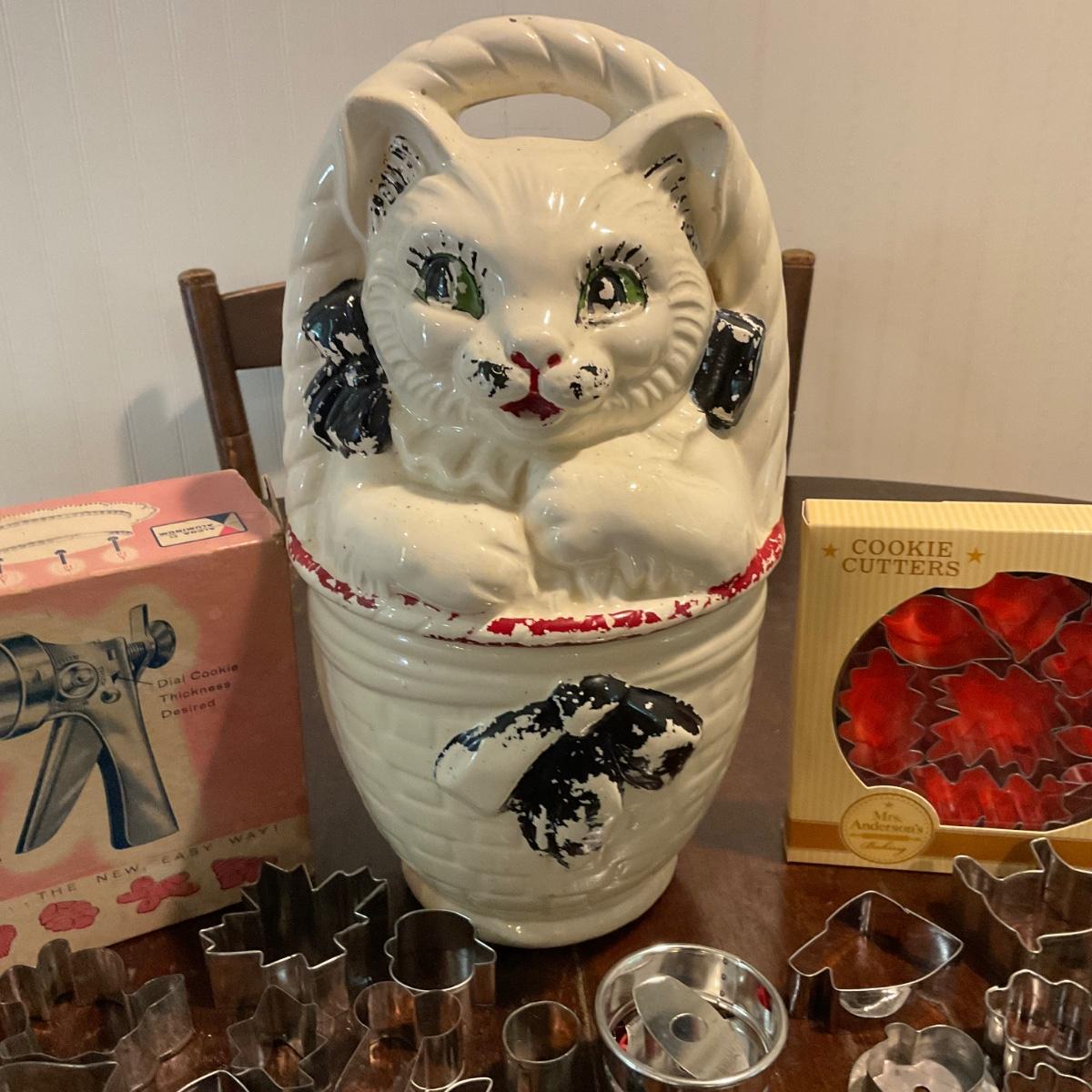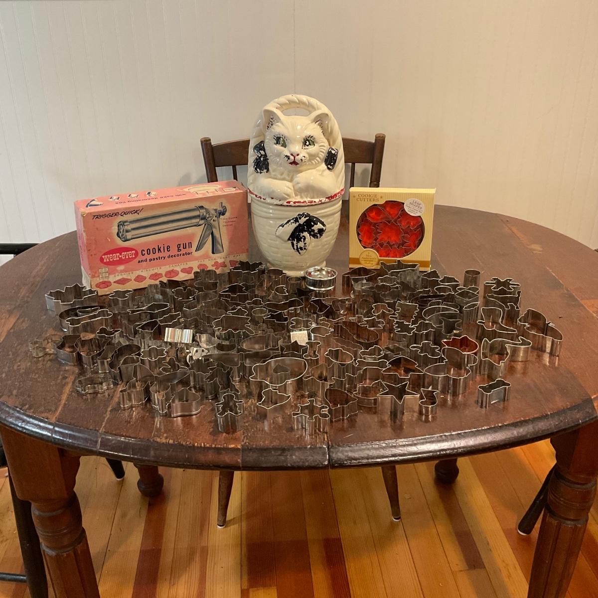 Includes assortment of cookie cutters ranging from Christmas, Easter, thanksgiving and everyday cuts, Wear-Ever cookie gun and vintage cat cookie jar.