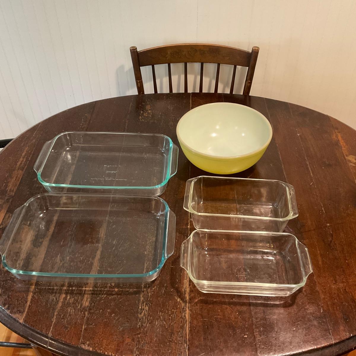 Includes two 3QT Pyrex, Yellow Pyrex mixing bowl 10.5”diameter, 4.5”H, Pyrex 9 x 5 x 4, Anchor Hocking 1QT