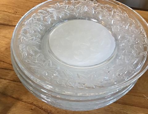 The salad plates are 8". The glass bowl is 9" across x 3-3/4" tall.