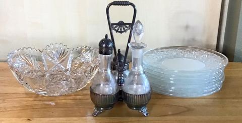 K131 - Silver Plate Cruet Set, Cut glass Bowl & 7 Salad Plates