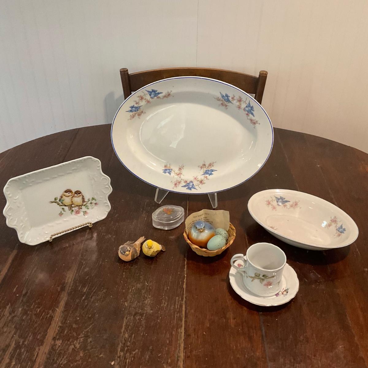 Includes small handmade birds, trinket box, tea cup and saucer.