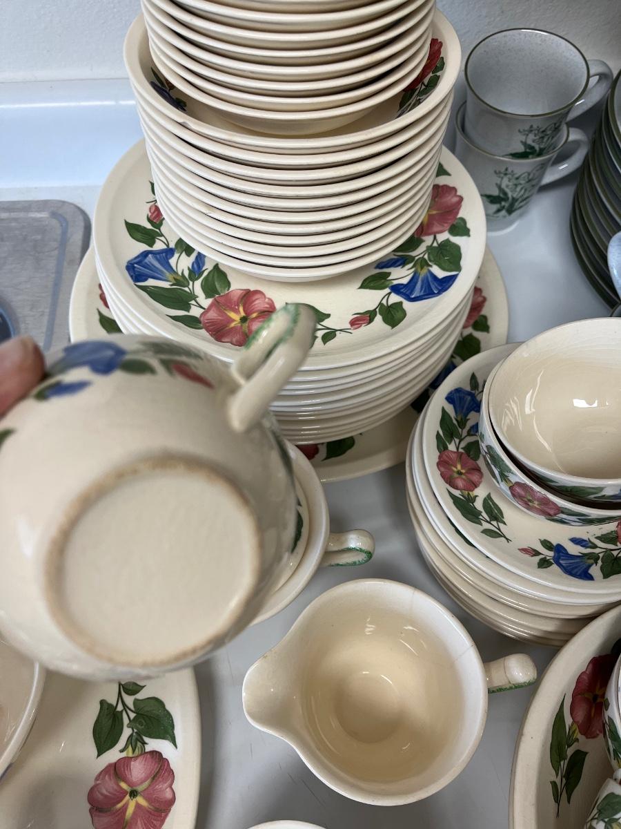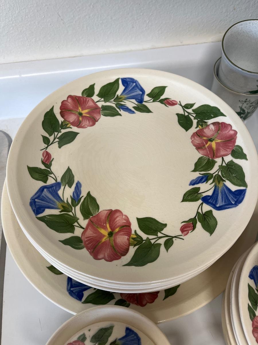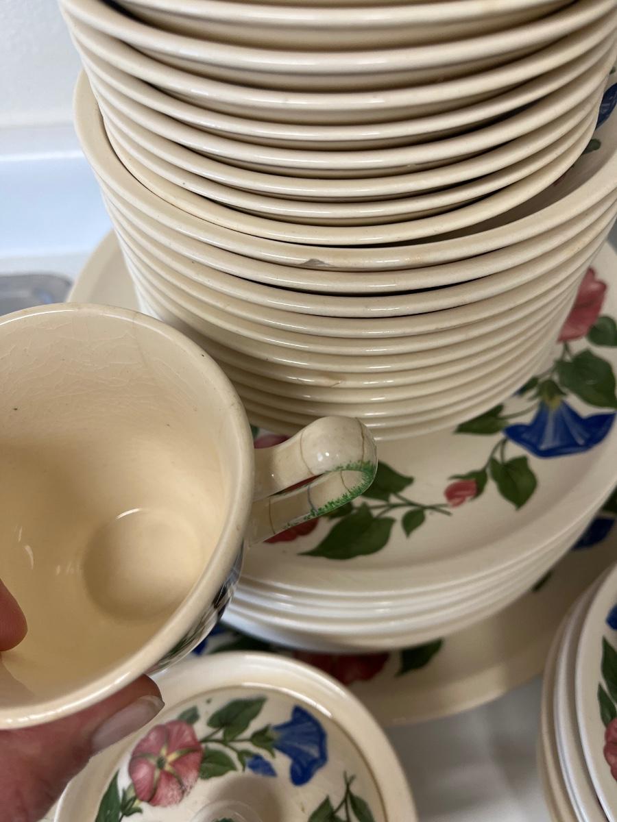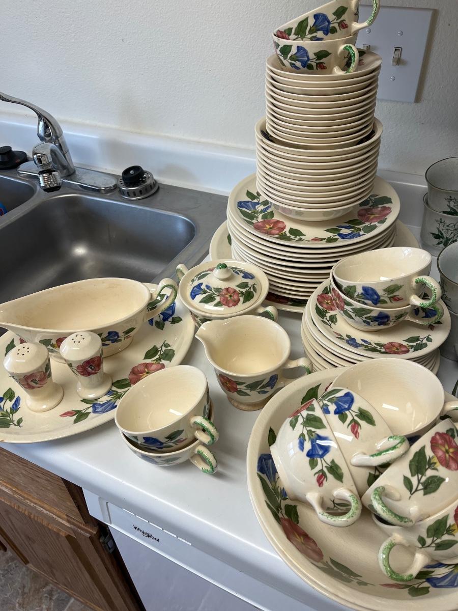 Service for 8. Some pieces have chips. Creamers handle has been repaired. Pretty nice shape for how old it is!!