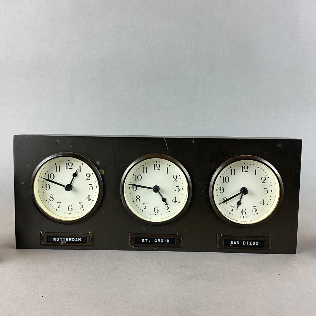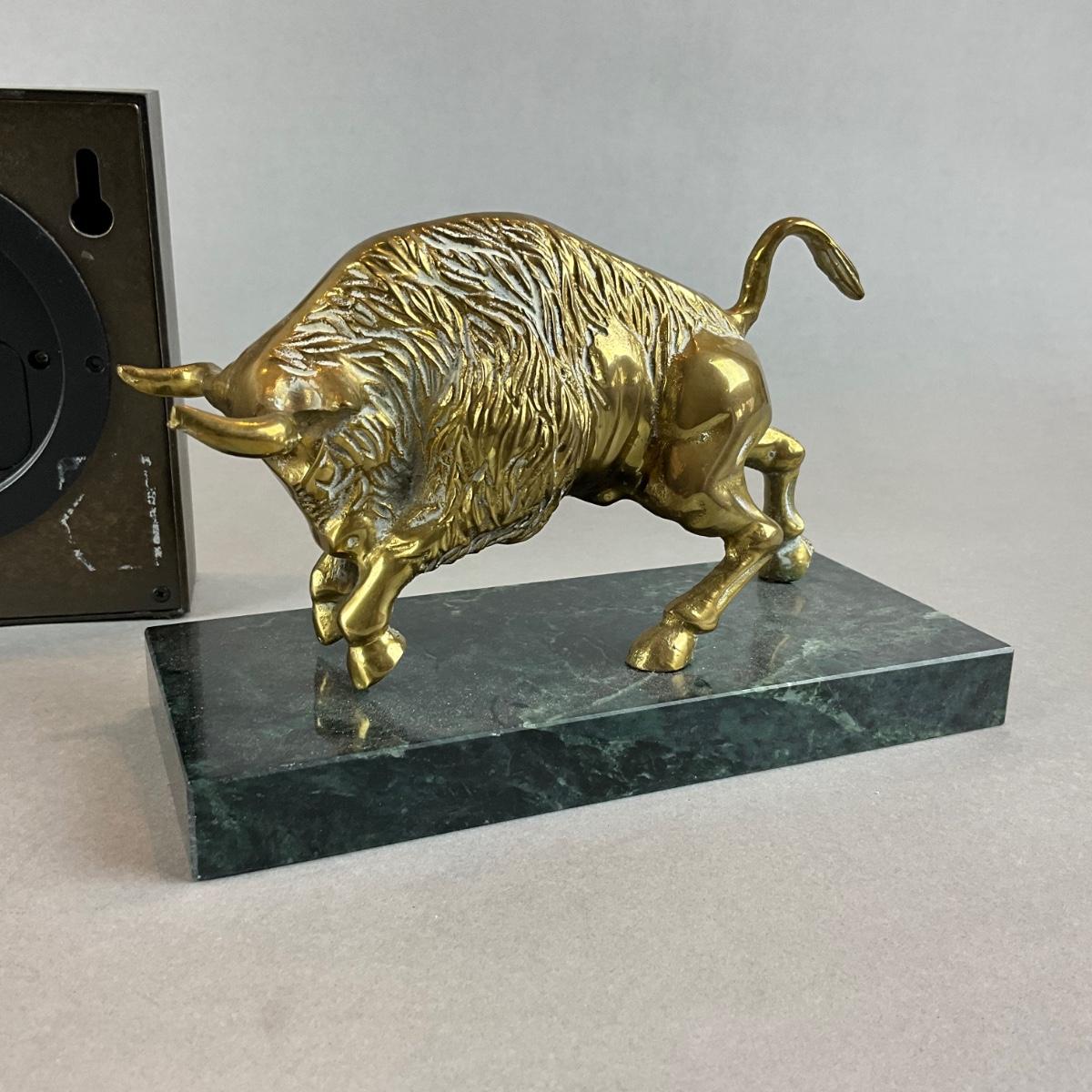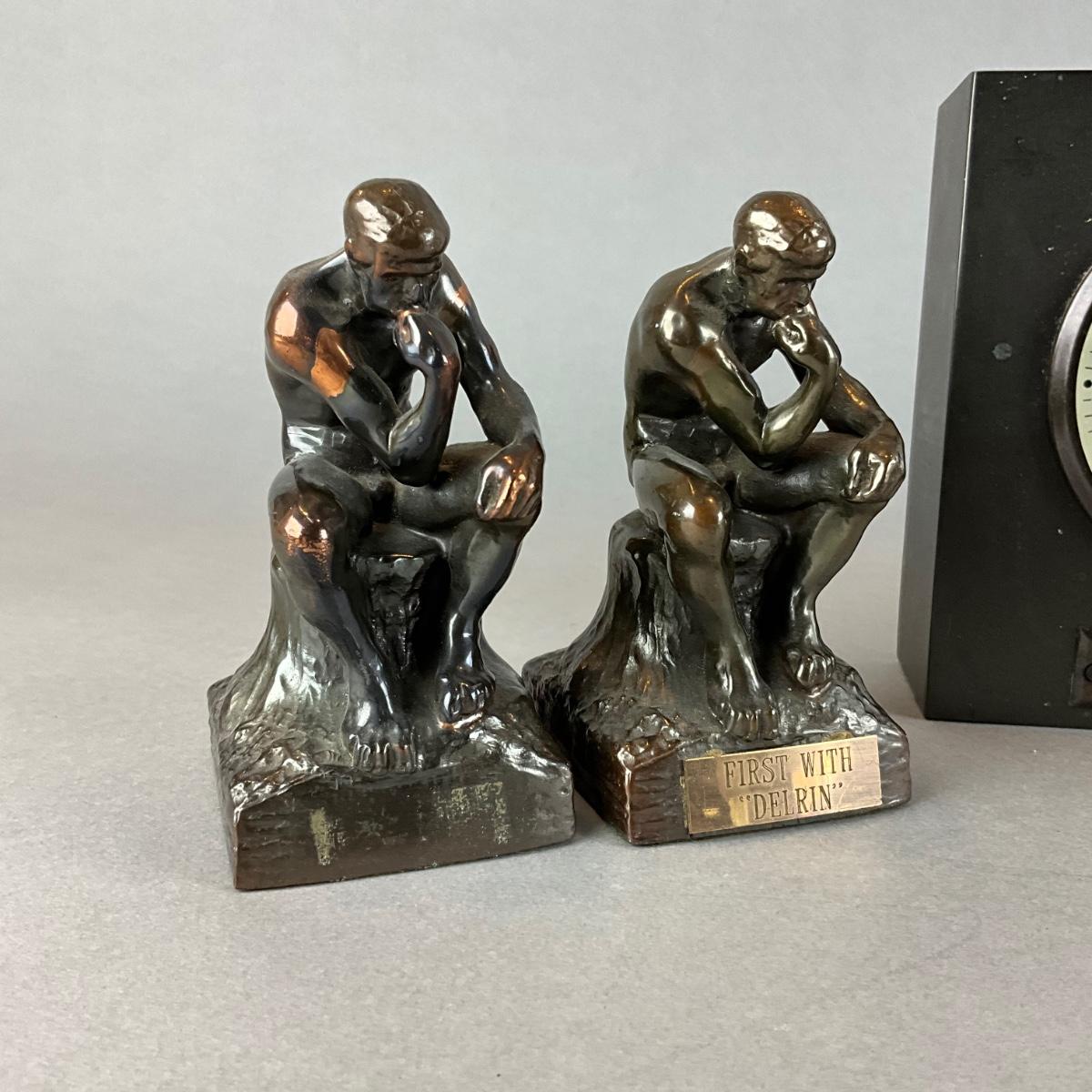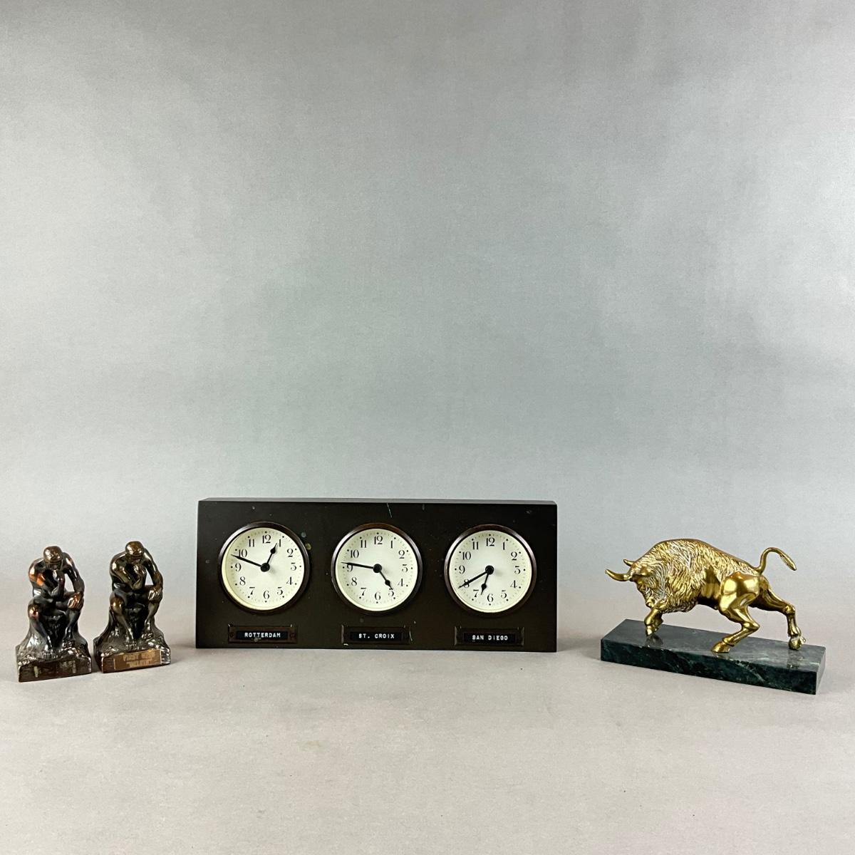 Brass bull on marble stand with "The Thinker " bookends and Pottery barn work clock