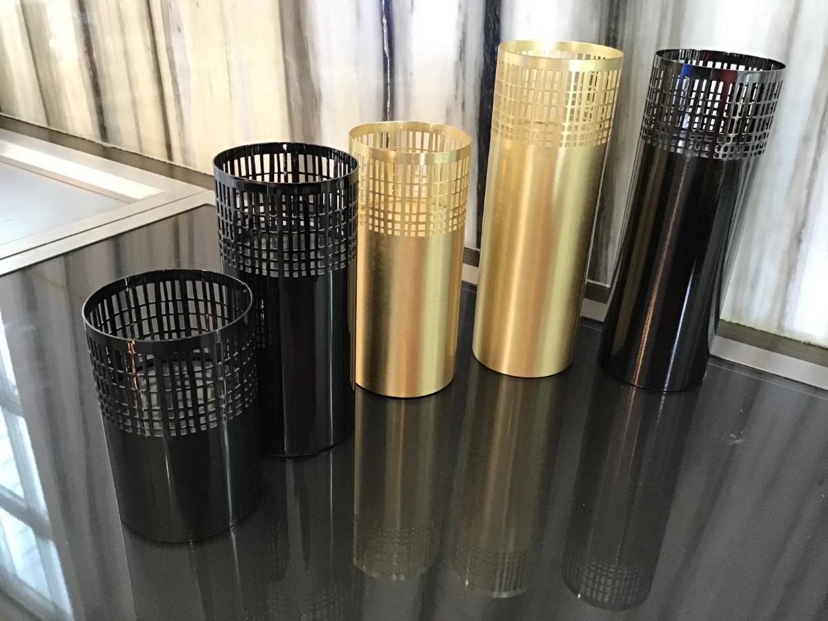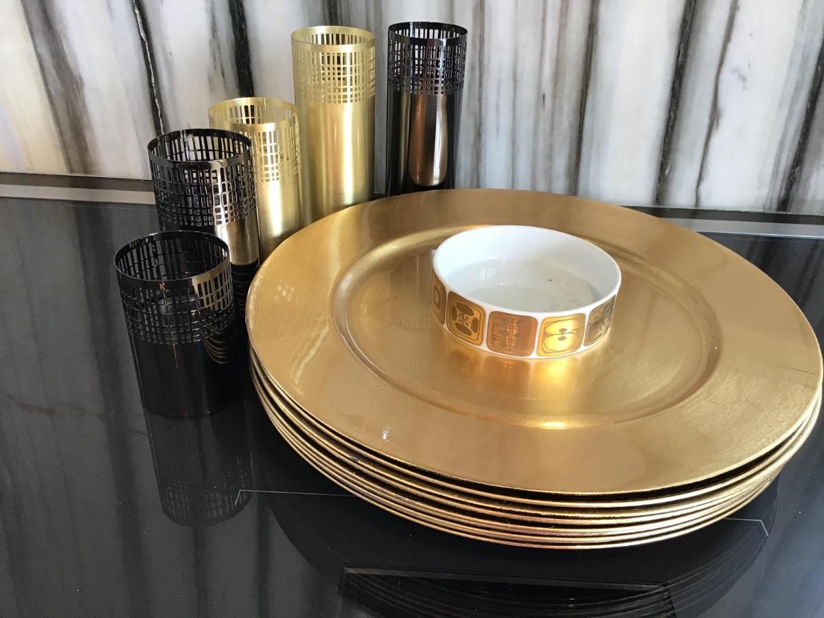 K139 - 9 Gold Charger Plates, Black & Gold Votive Holders (5)