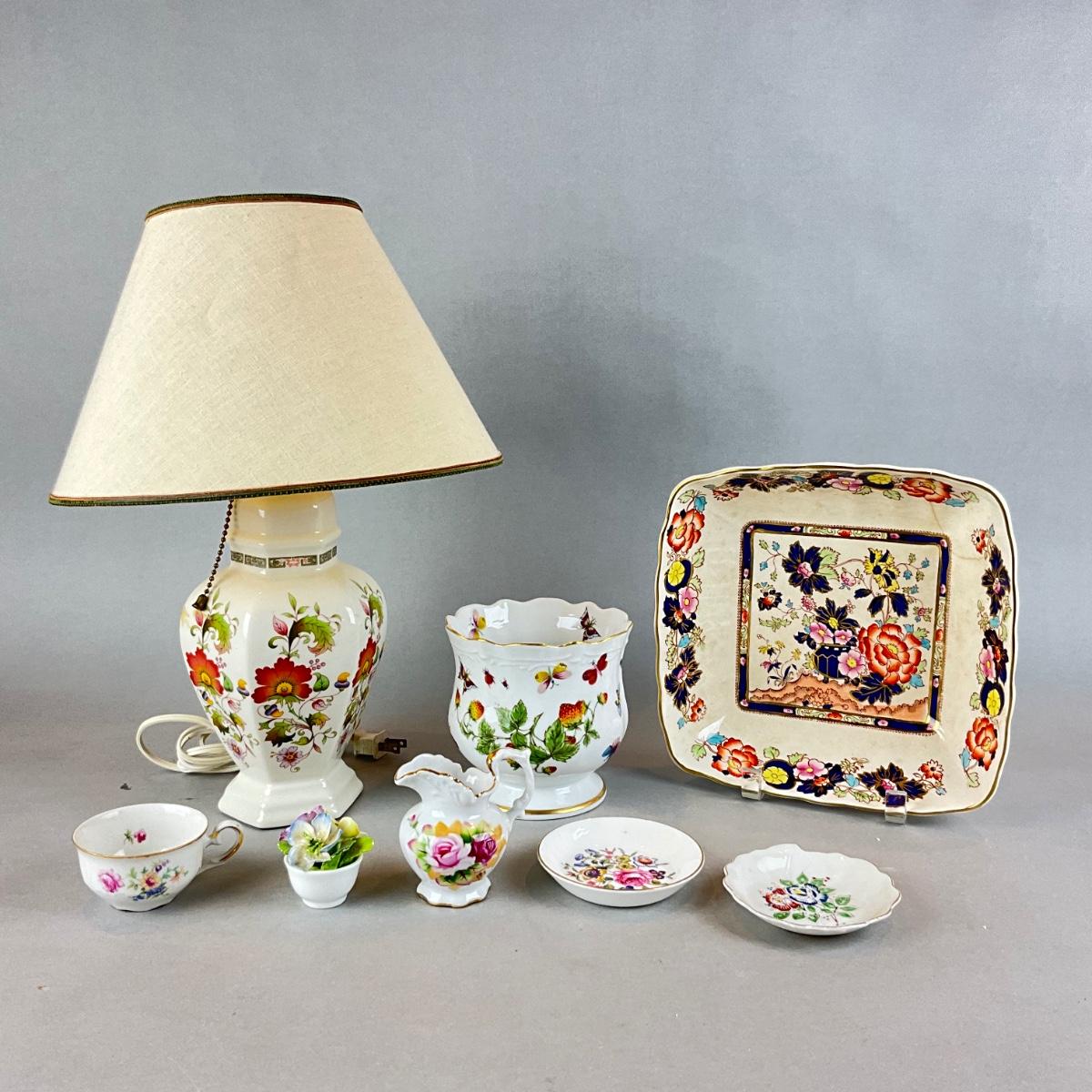 Floral porcelain dishes and Lamp measures 16" high