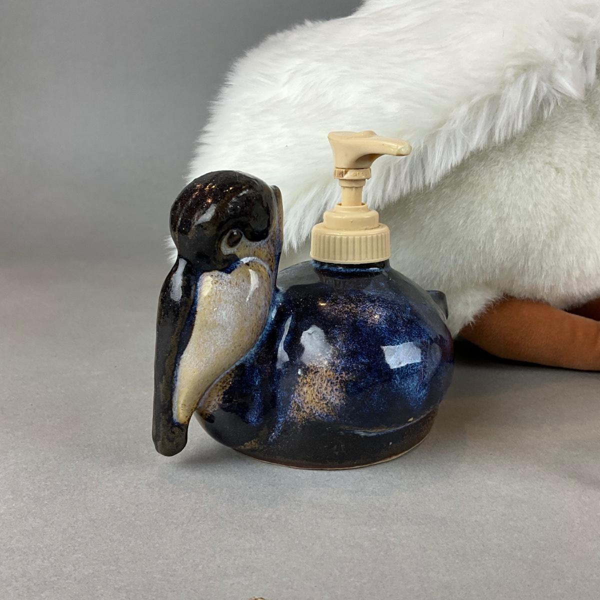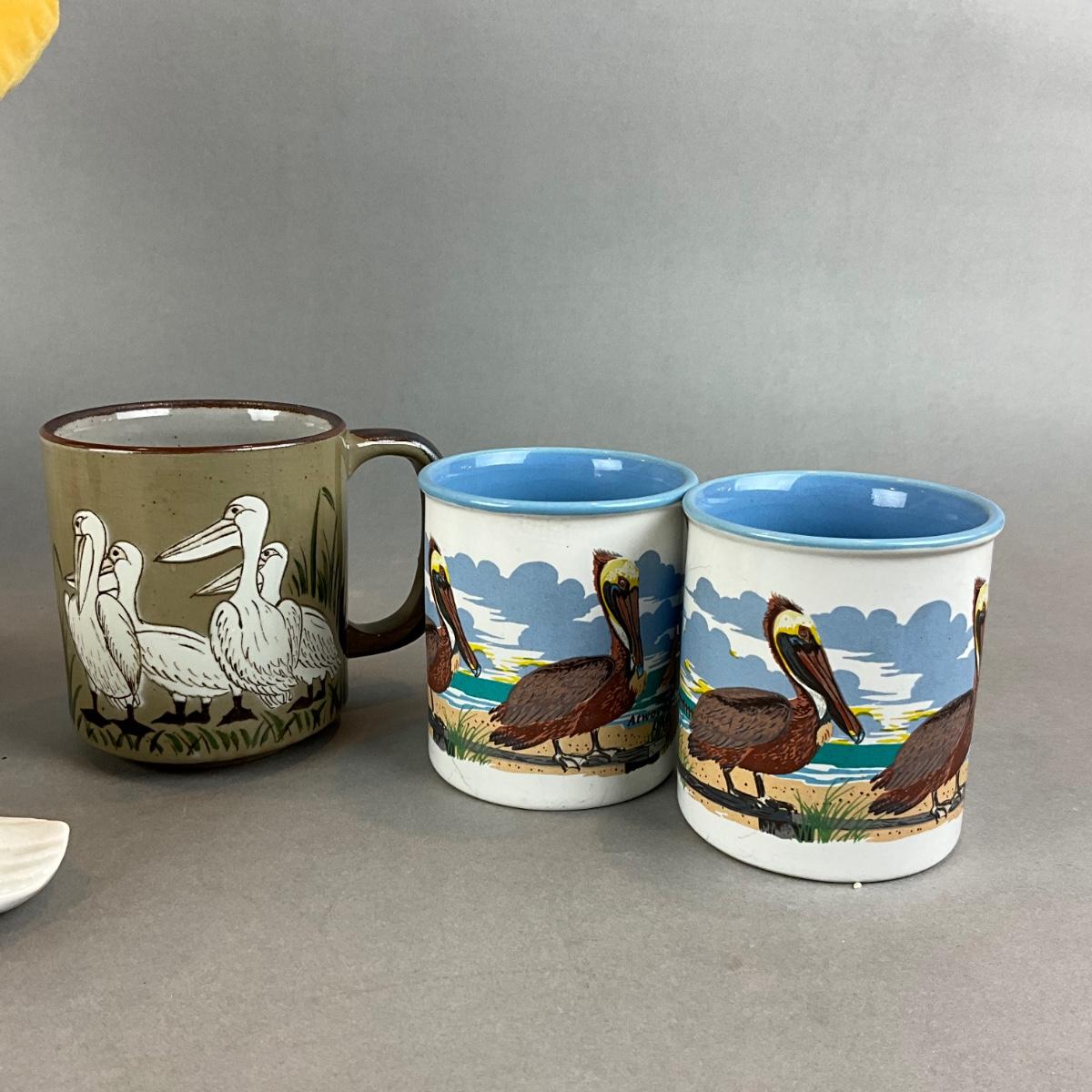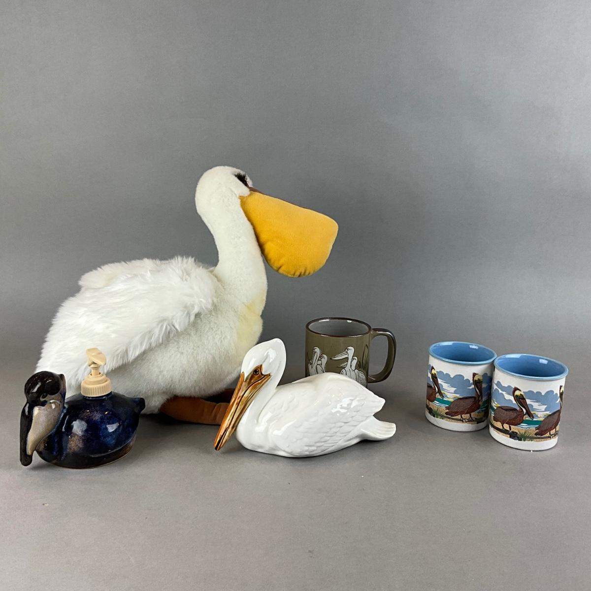 Stuffed animal, napco ware porcelain pelican, set of mugs and pelican pottery hand soap dispenser