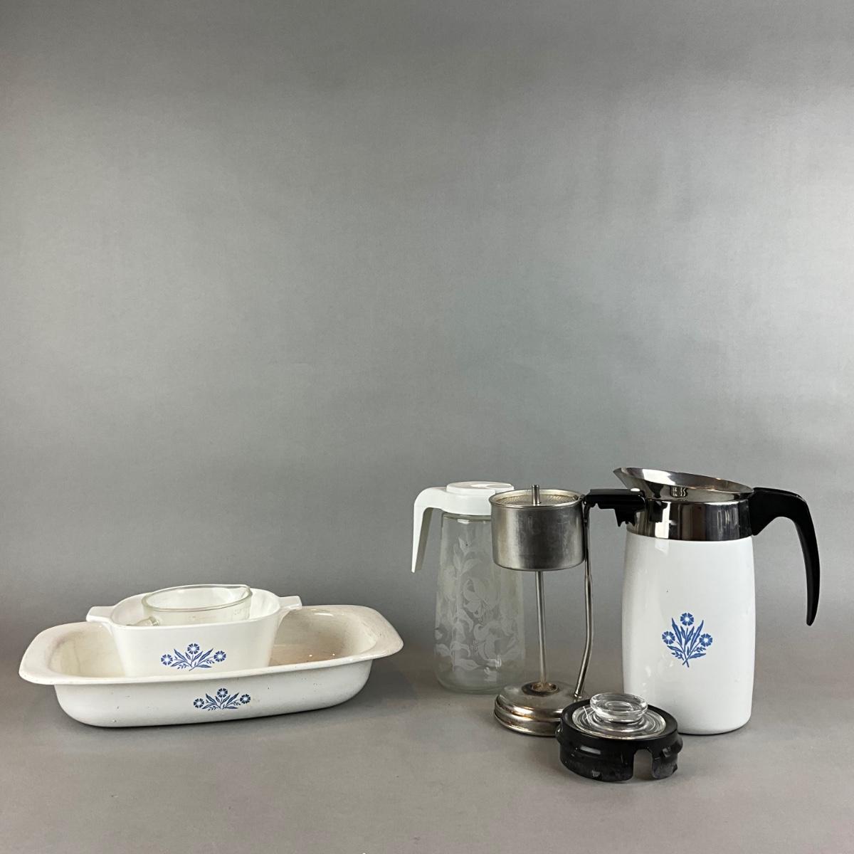 Vintage coffee pot with corningware dishes , and vintage 1970 Tang glass pitcher