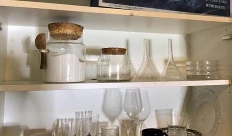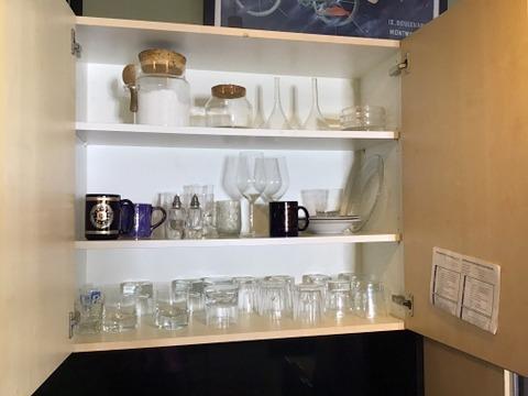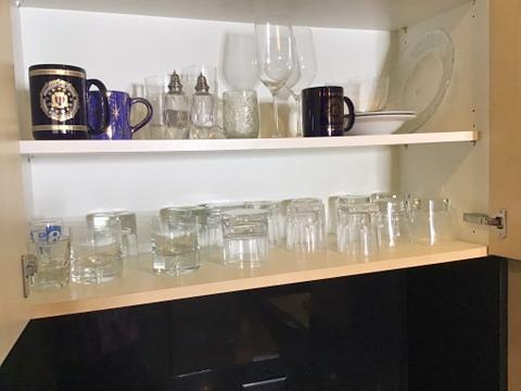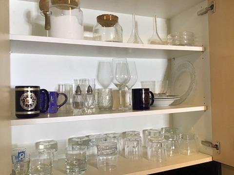 Very cute glass sugar canister on the top shelf. Lots of glasses & mugs.
