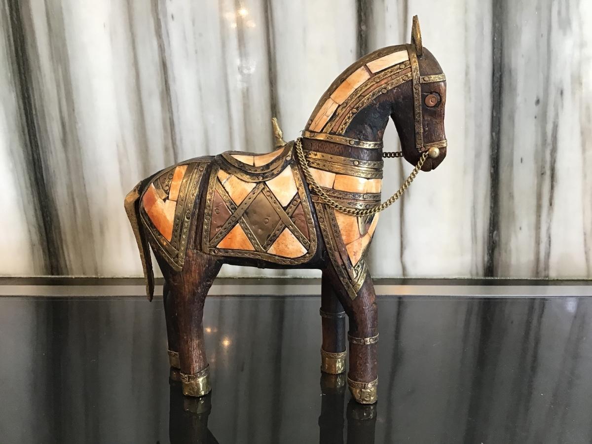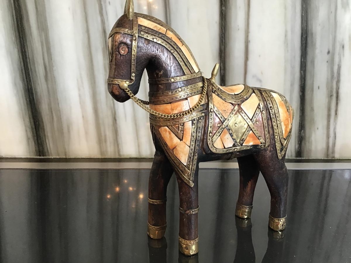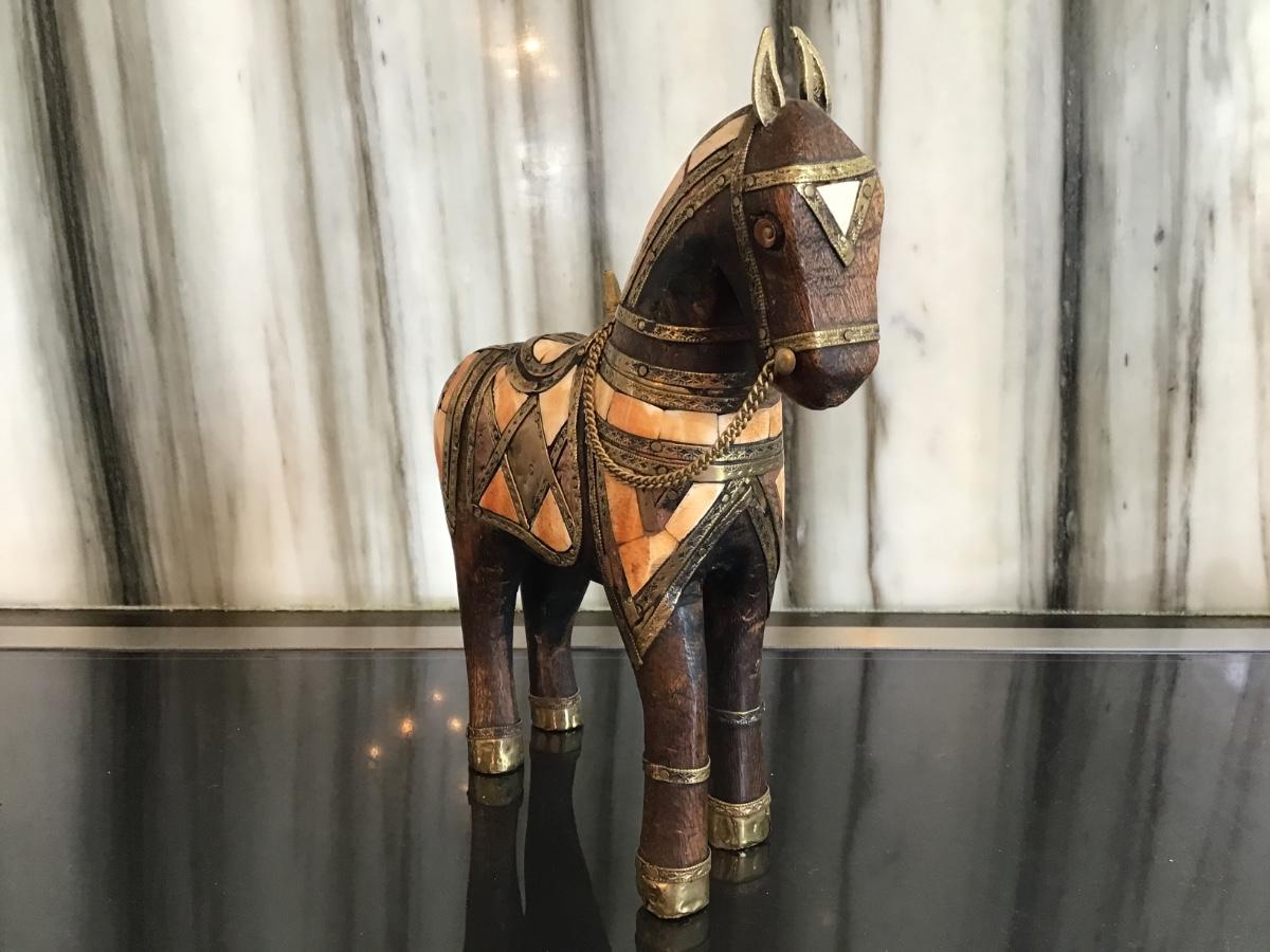 K148 - Awesome Wood Horse w/Inlays & Brass Accents, 8” tall