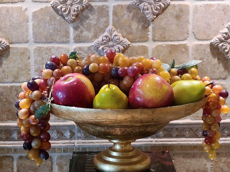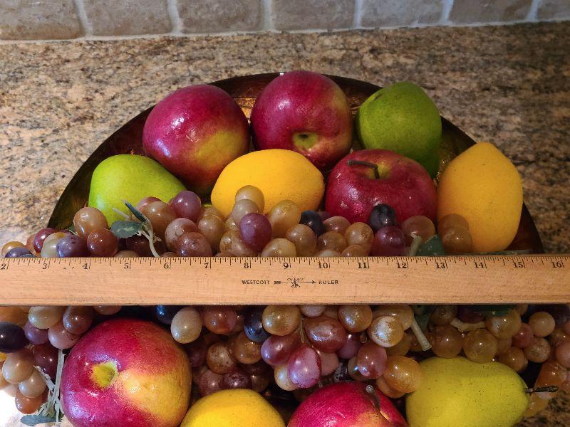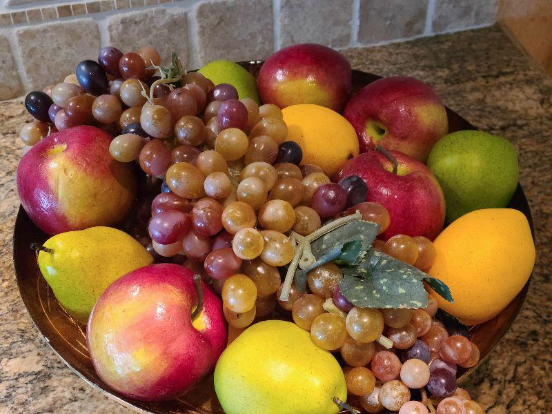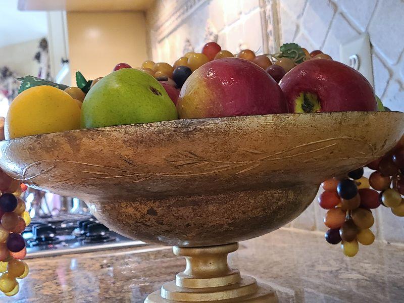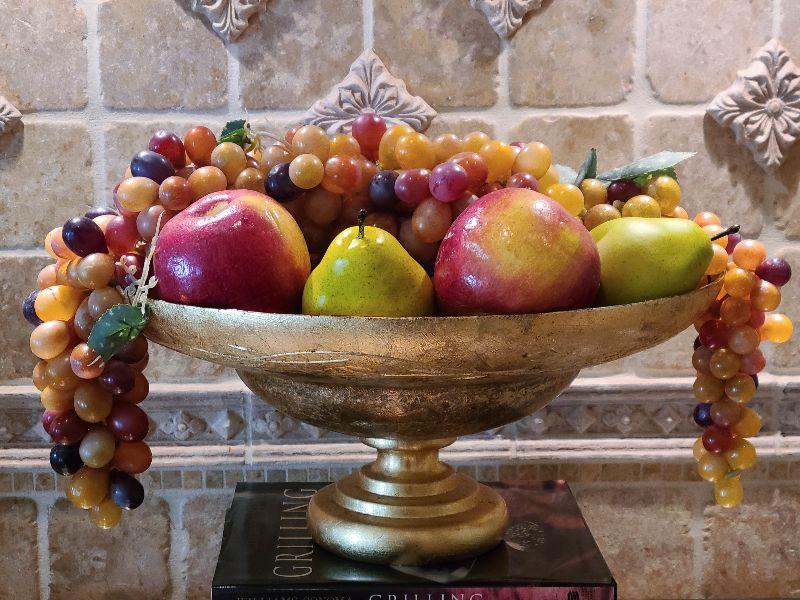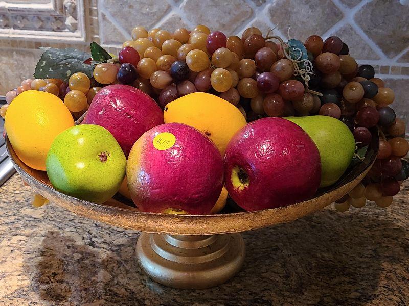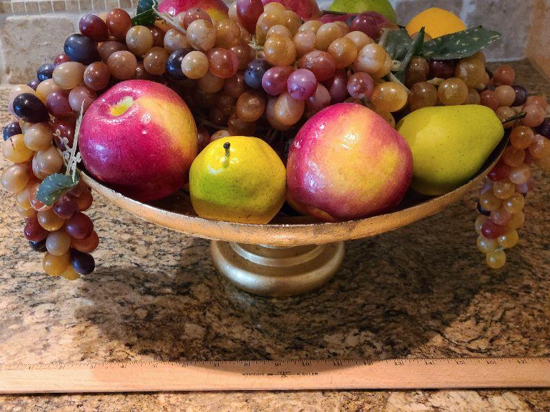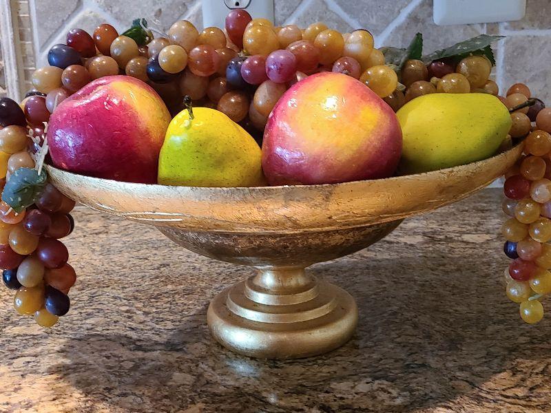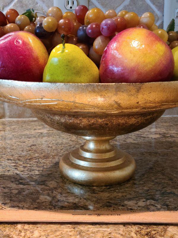This a lovely large gold fruit decorated bowl with plastic vintage fruit! Please see pictures for content/condition of the lot. Good luck and happy bidding.