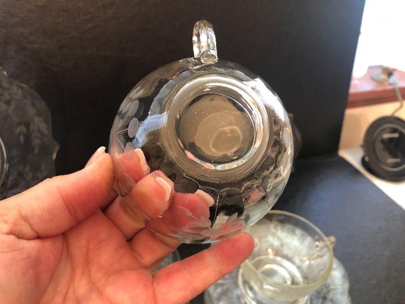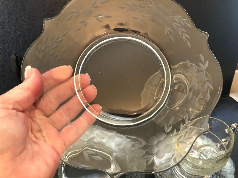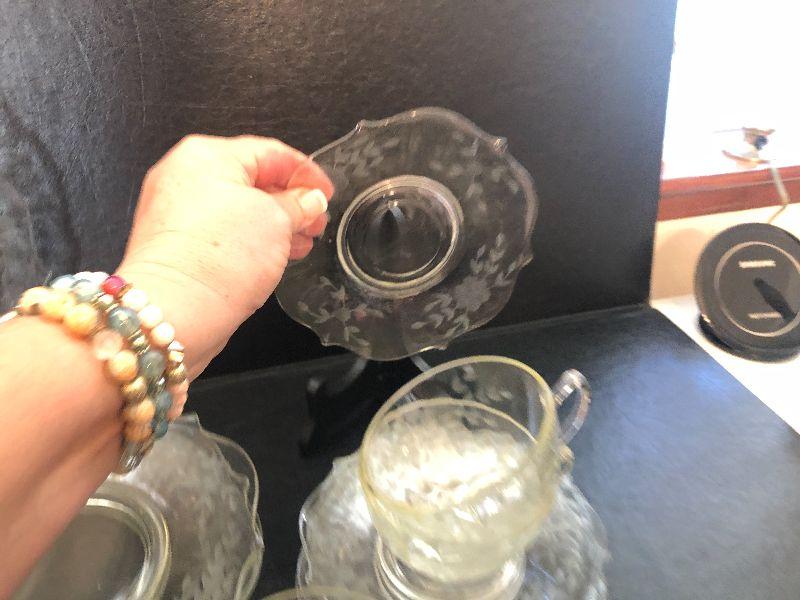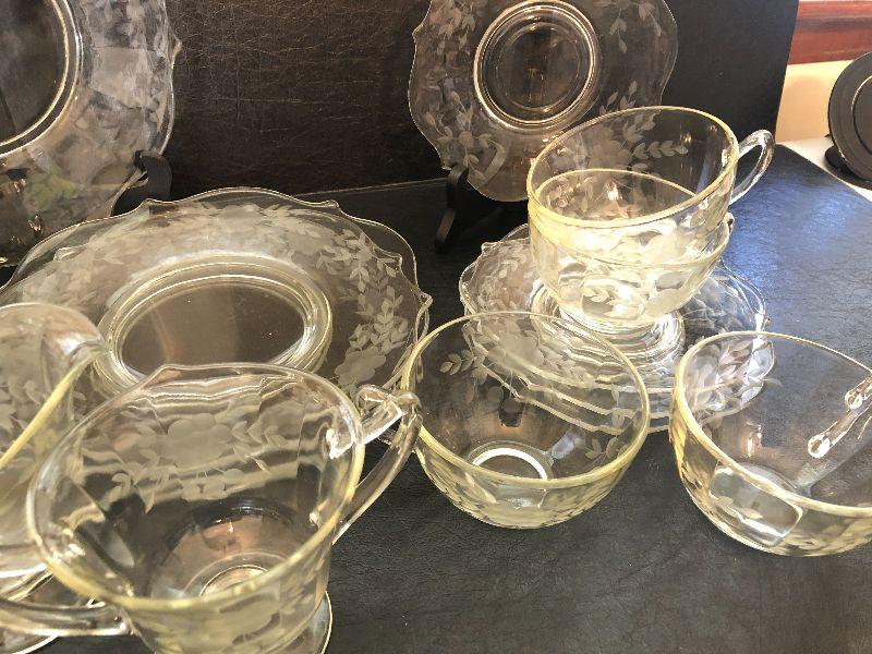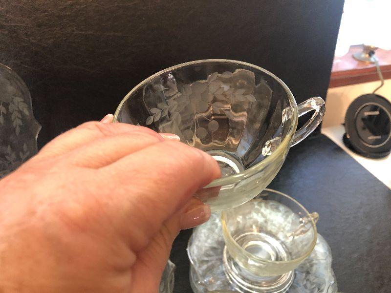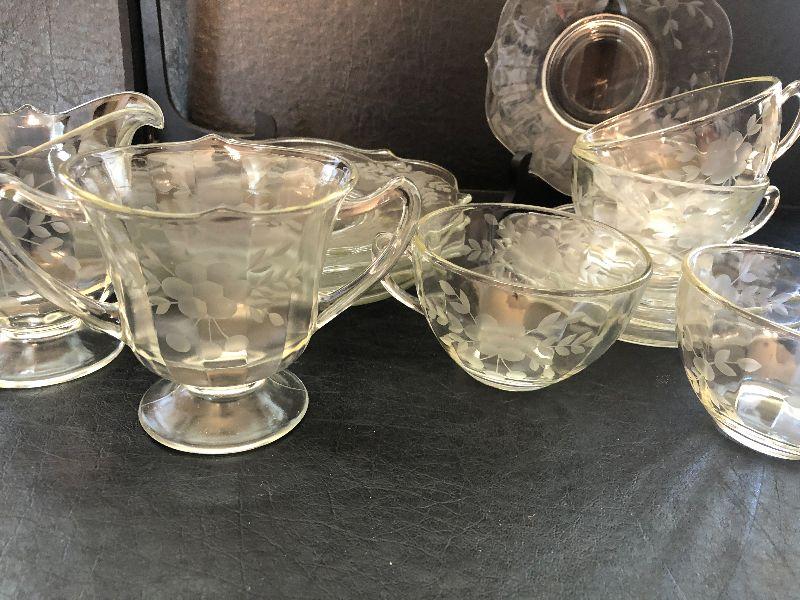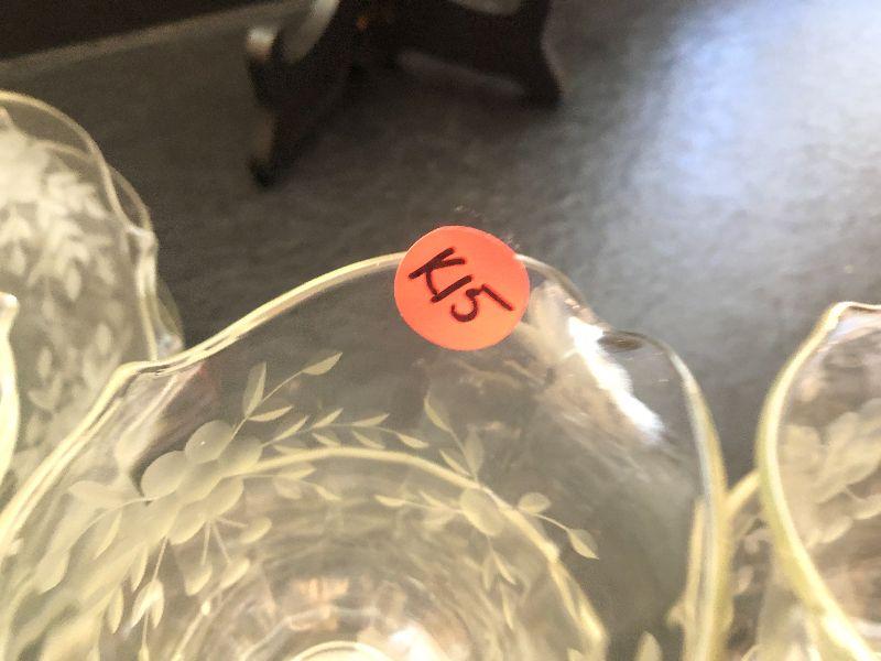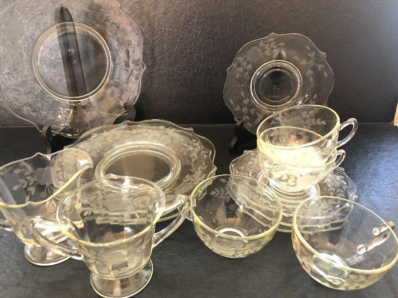This lot is clear with etched flowers and stems on depression glass. Please see all pictures for exact contents of the lot, condition of the items, and if measurements if taken. Thank you for looking and have fun bidding.