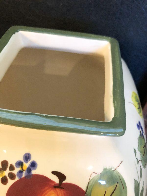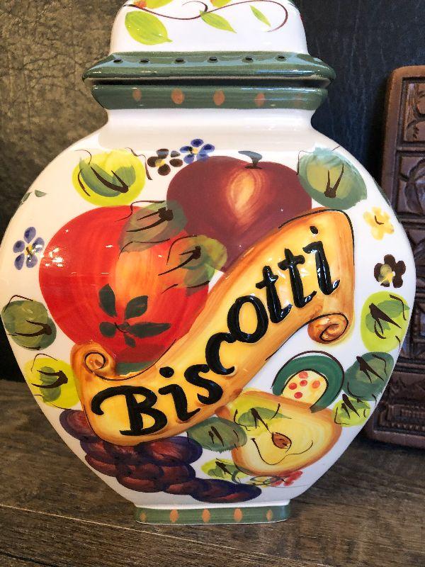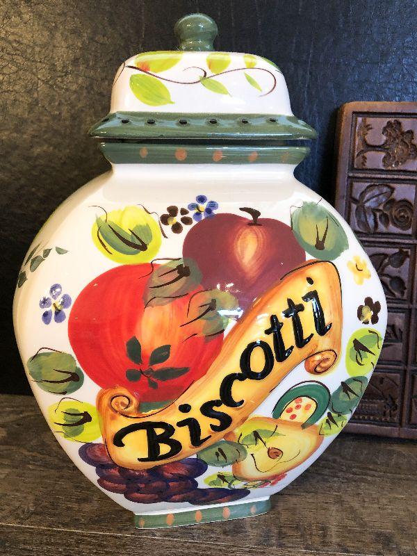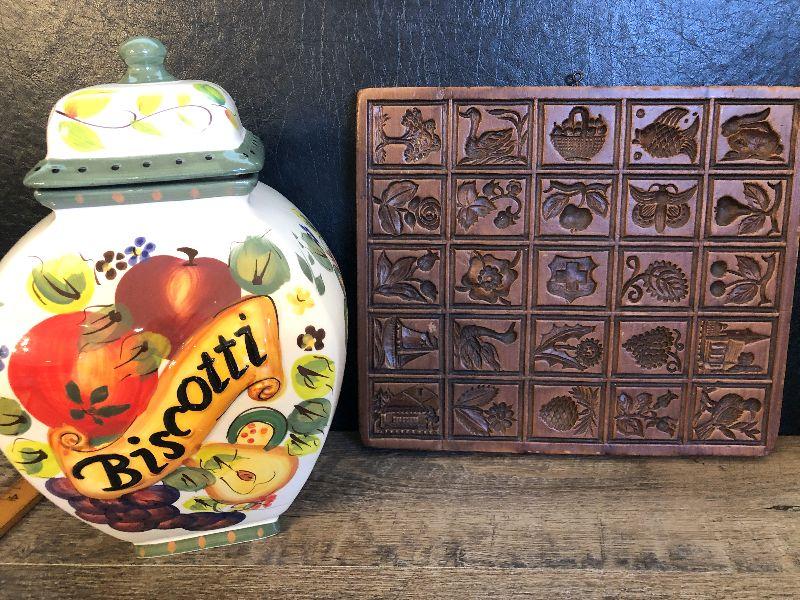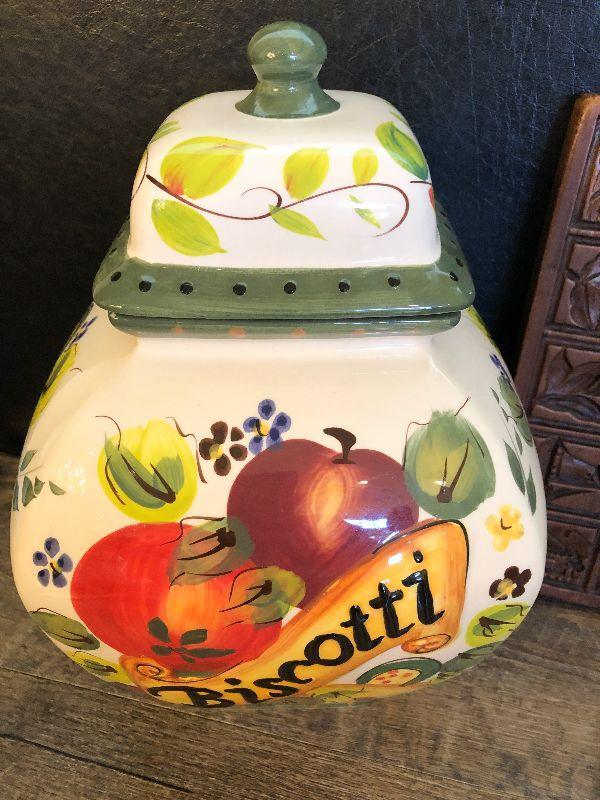 Reproduction Springerle and biscotti jar. Please refer to photos for size and condition. Have fun and happy bidding.