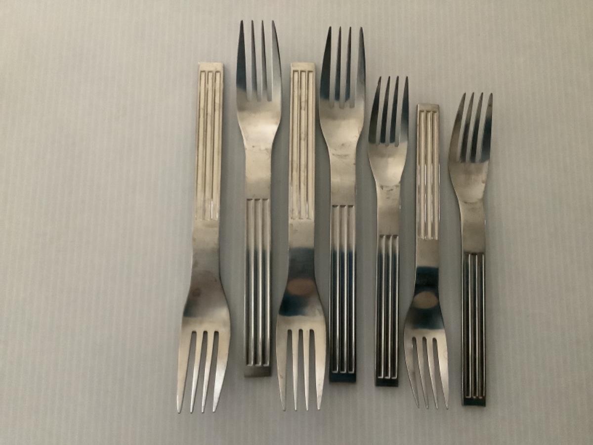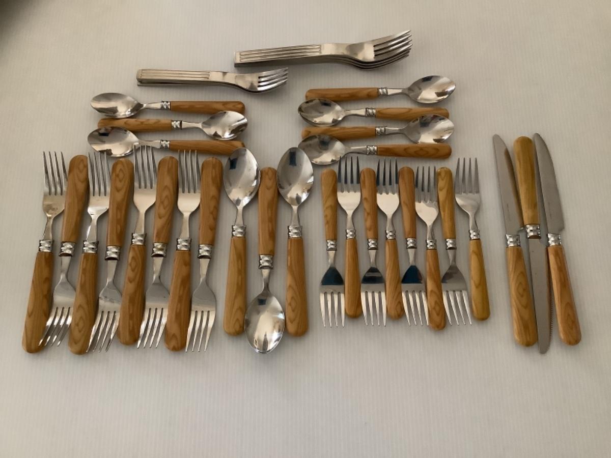 Cooks club has bamboo style handle and has 29 pcs. 3 knives, 3 large soup spoons, 7 teaspoons, 8 dinner forks, 8 salad forks