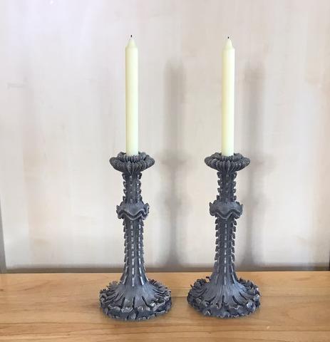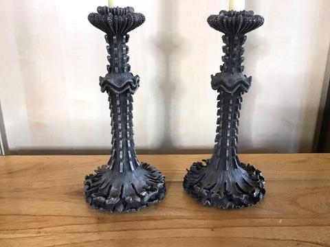 These attractive metal candlesticks stand 12" tall and are solid with some weight to them.