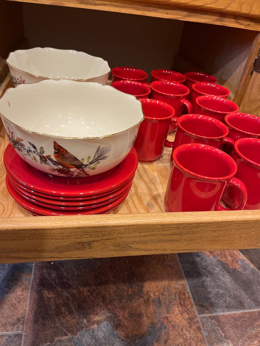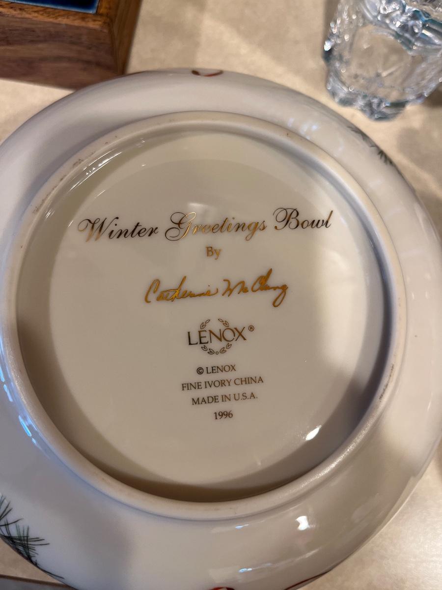 K17- Lenox Winter Greetings Bowl & Pier 1 plates & mugs