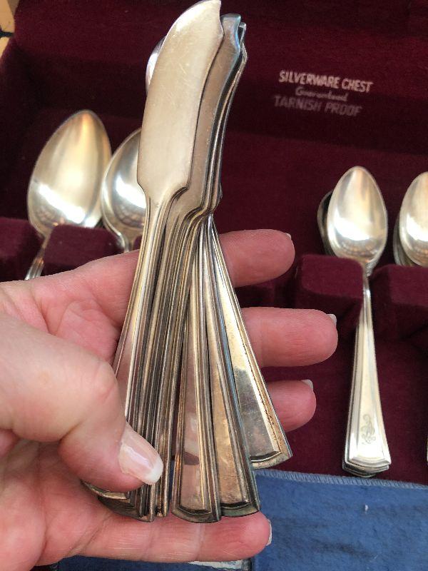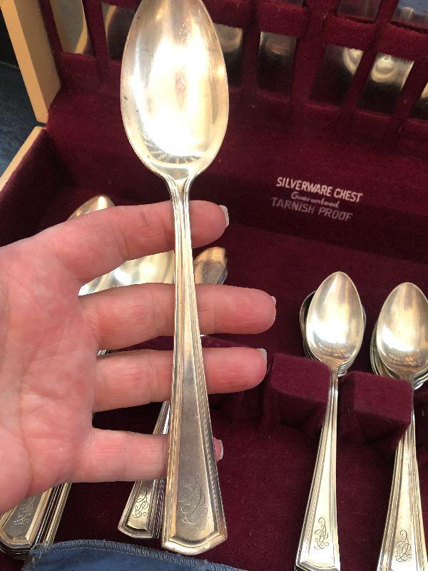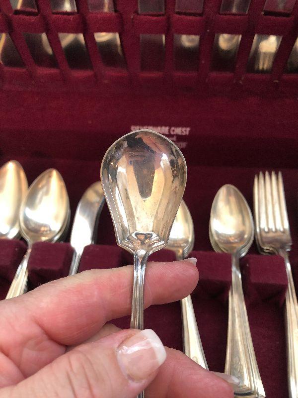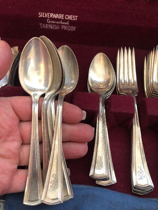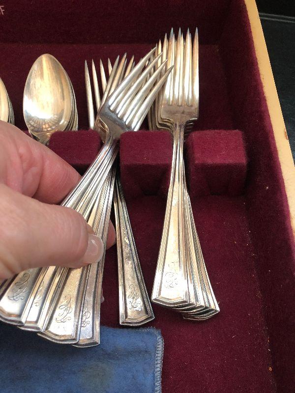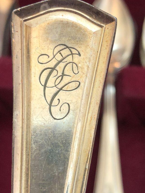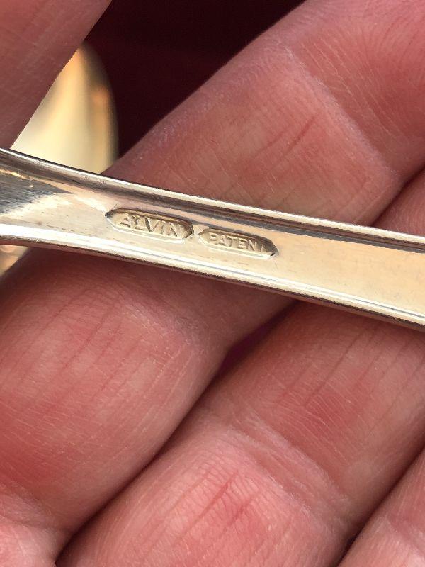 Alvin silverware and chest. This is not marked sterling silver, only Alvin. Excellent serving set, does have monogram. Please see all pictures for exact contents of the lot, condition of the items, and if measurements if taken. Thank you for looking and have fun bidding.