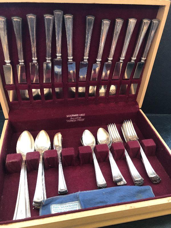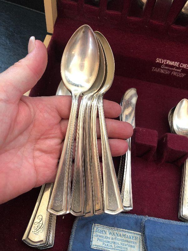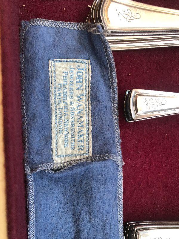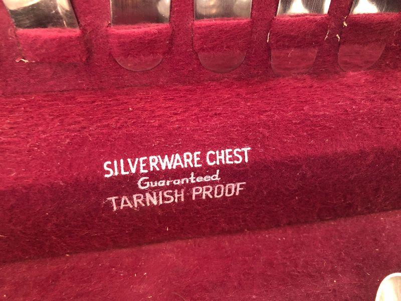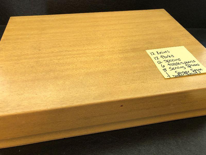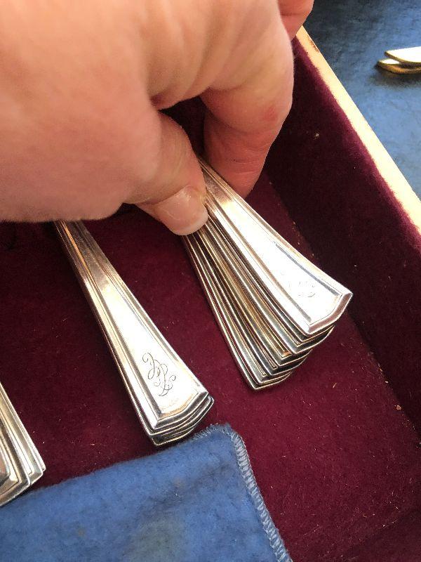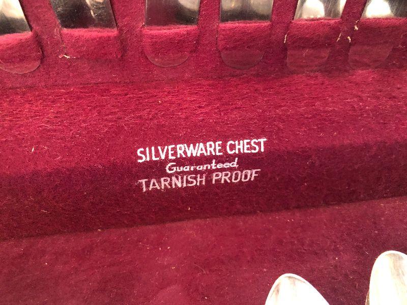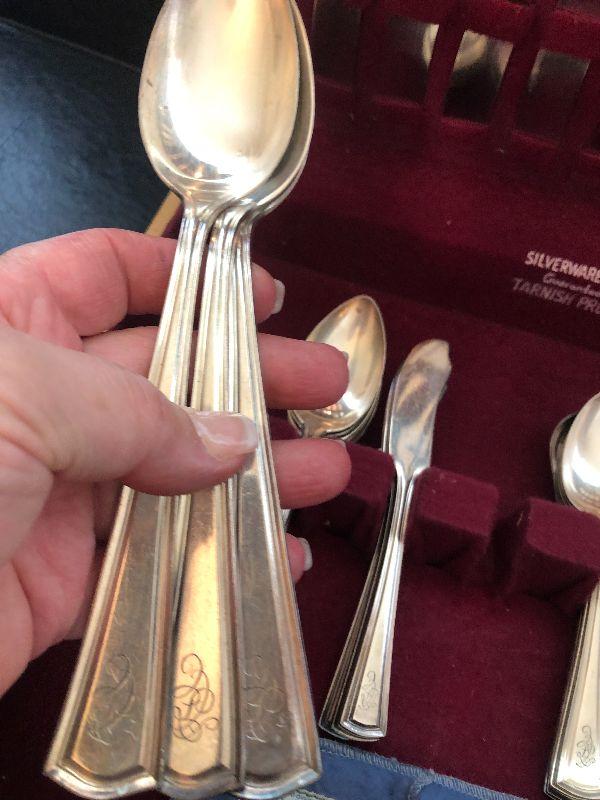 Alvin silverware and chest. This is not marked sterling silver, only Alvin. Excellent serving set, does have monogram. Please see all pictures for exact contents of the lot, condition of the items, and if measurements if taken. Thank you for looking and have fun bidding.