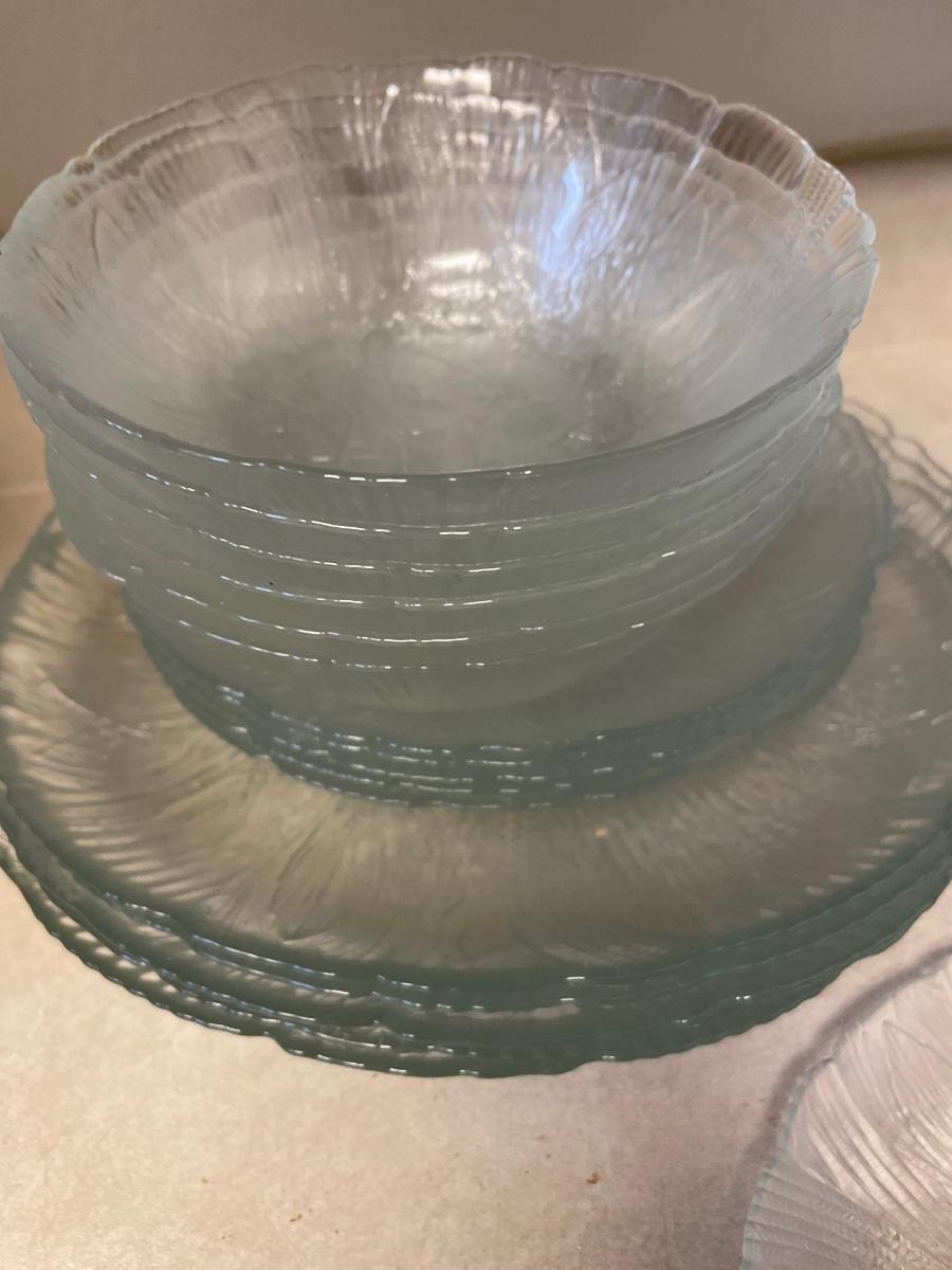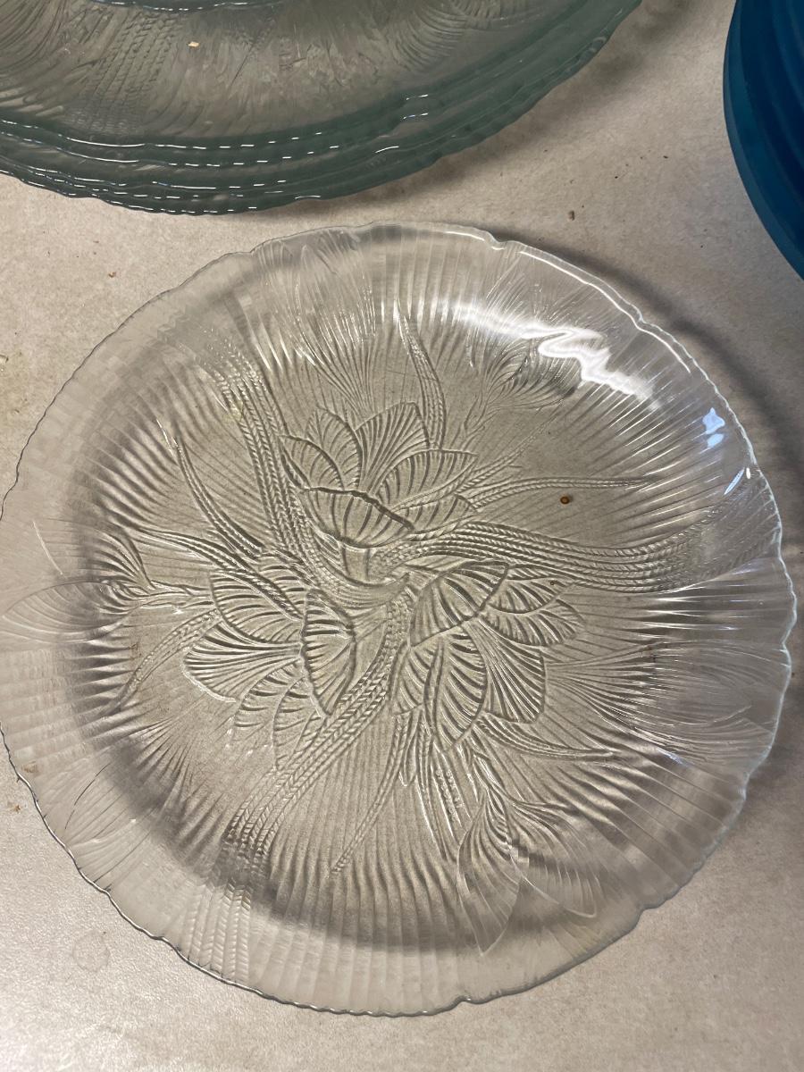 Blue (6 plates, 5 bowls), clear (5 dinner plates, 6 salad plates & bowls