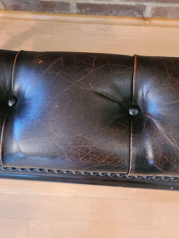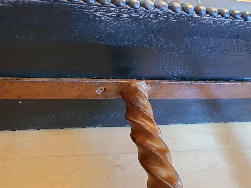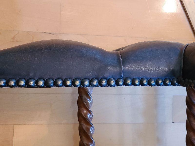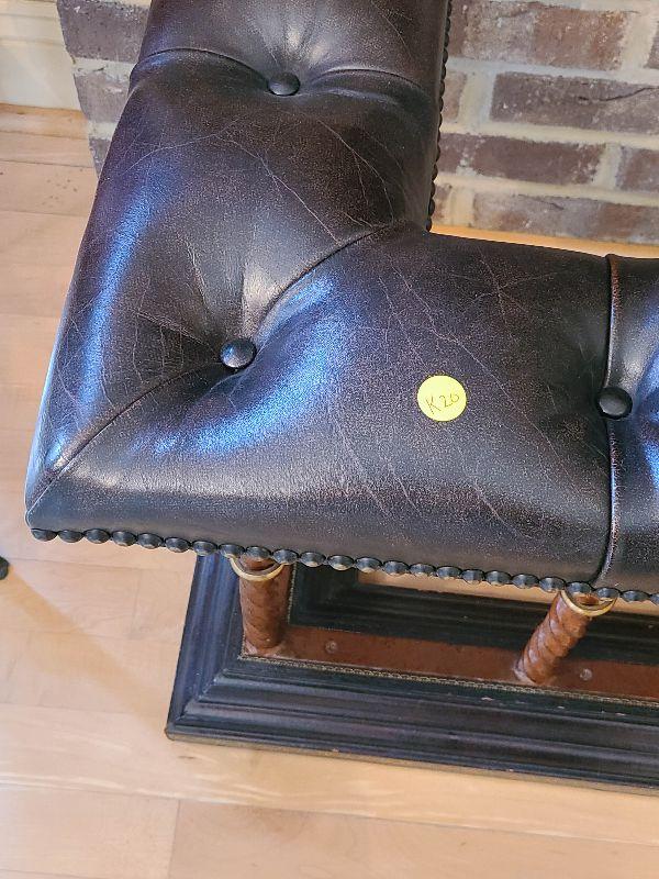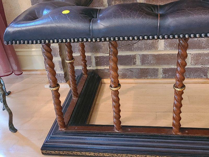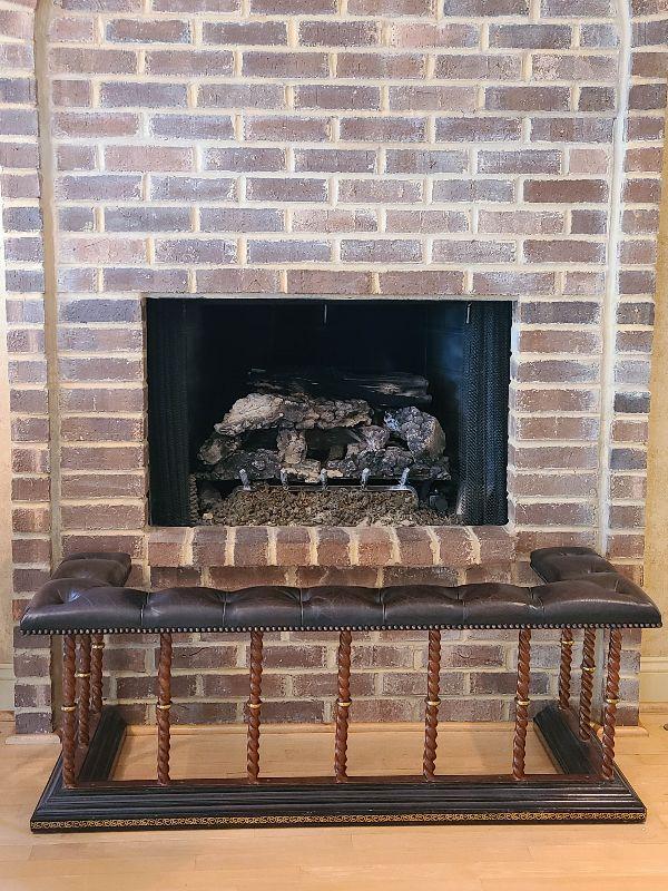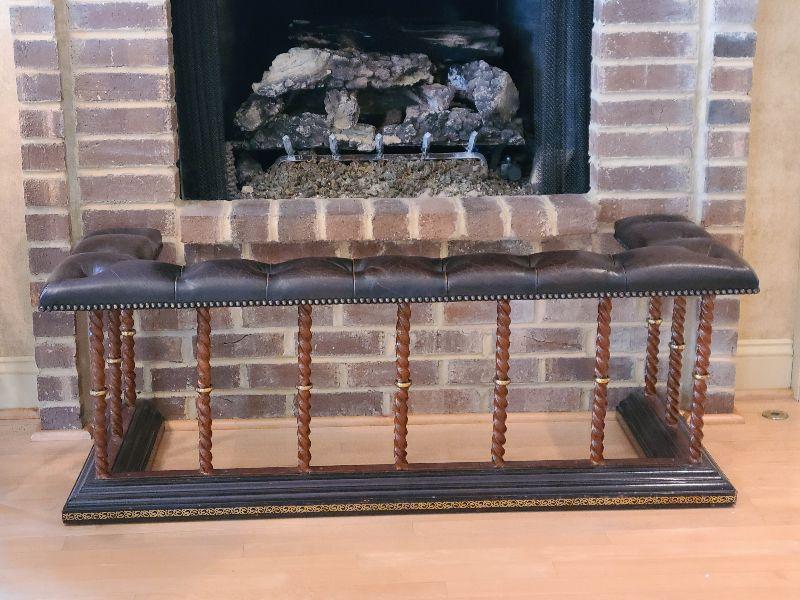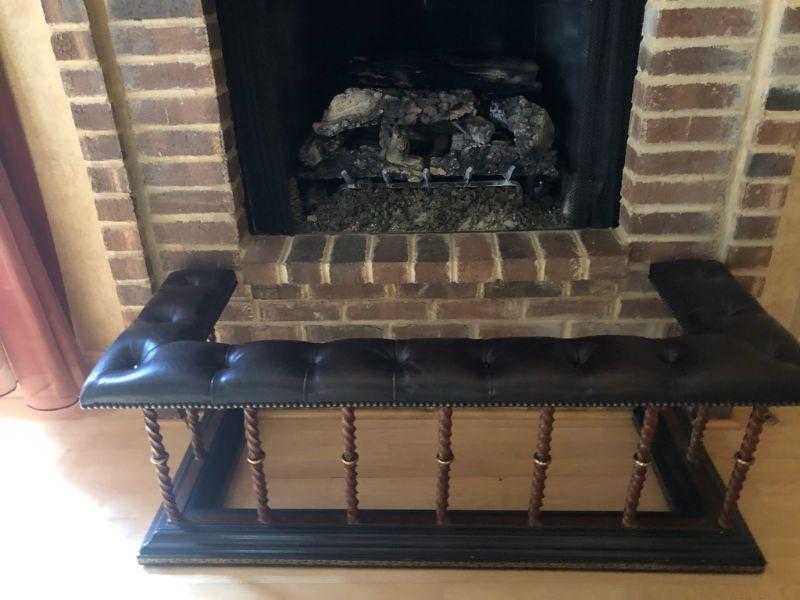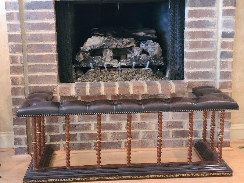 This is uniquely designed and is replica of an Old English leather sitting bench. It is designed for a raised hearth. My client said when she entertained, everyone loved to sit there by the fire! Please see pictures for sizing and condition of this piece!