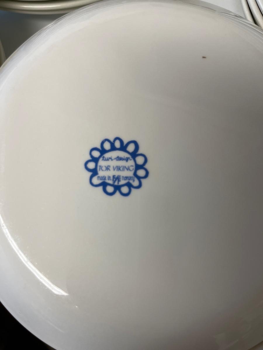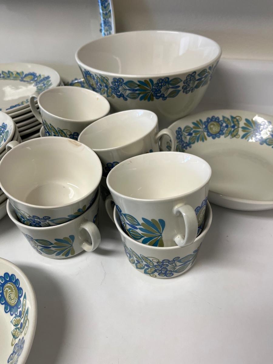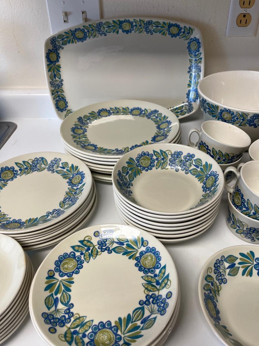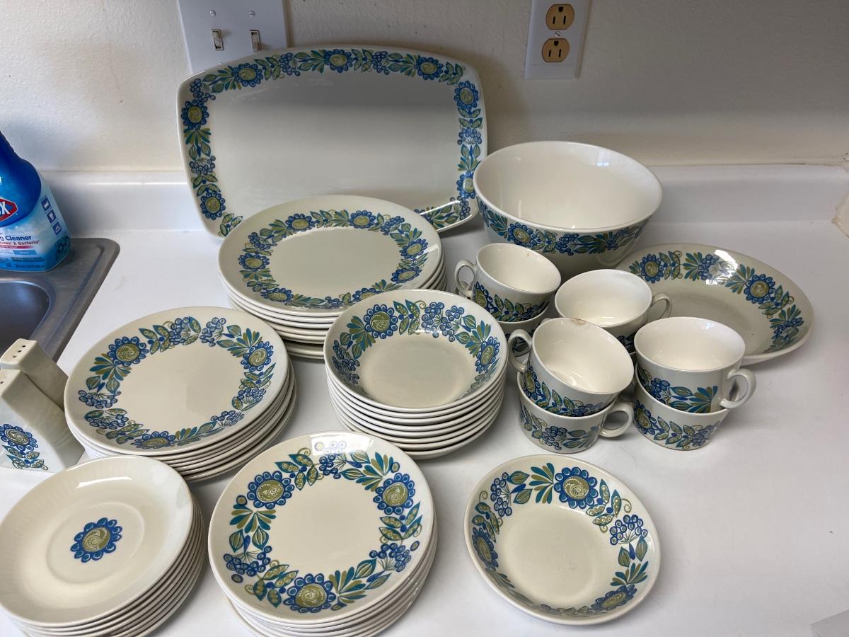 Complete set for eight people, including serving tray, and two bowls and salt and pepper. Appears in great shape. Bring packing material & boxes.