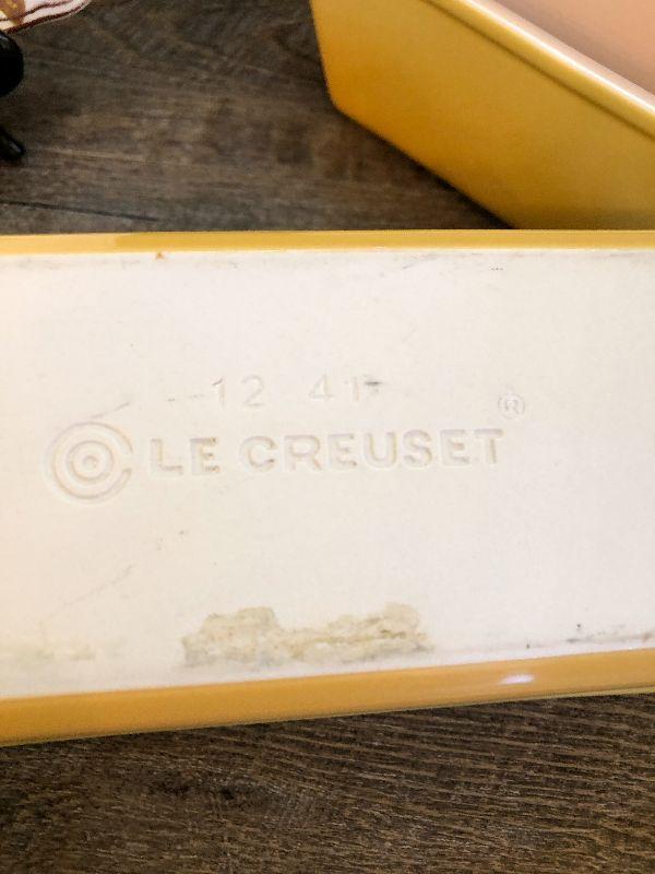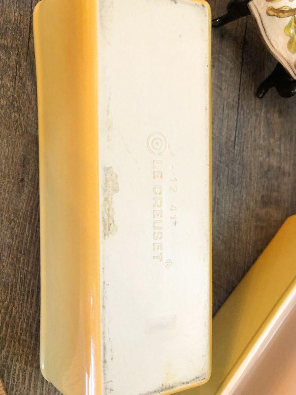 La Crueset Long Loaf Pans and Fall Serving Plate. Please refer to photos for size and condition. Have fun and happy bidding.