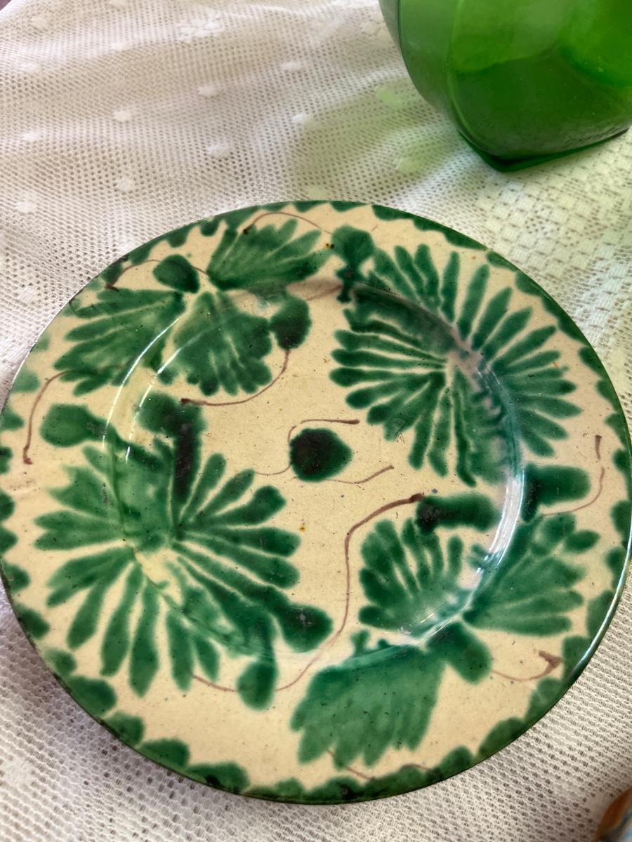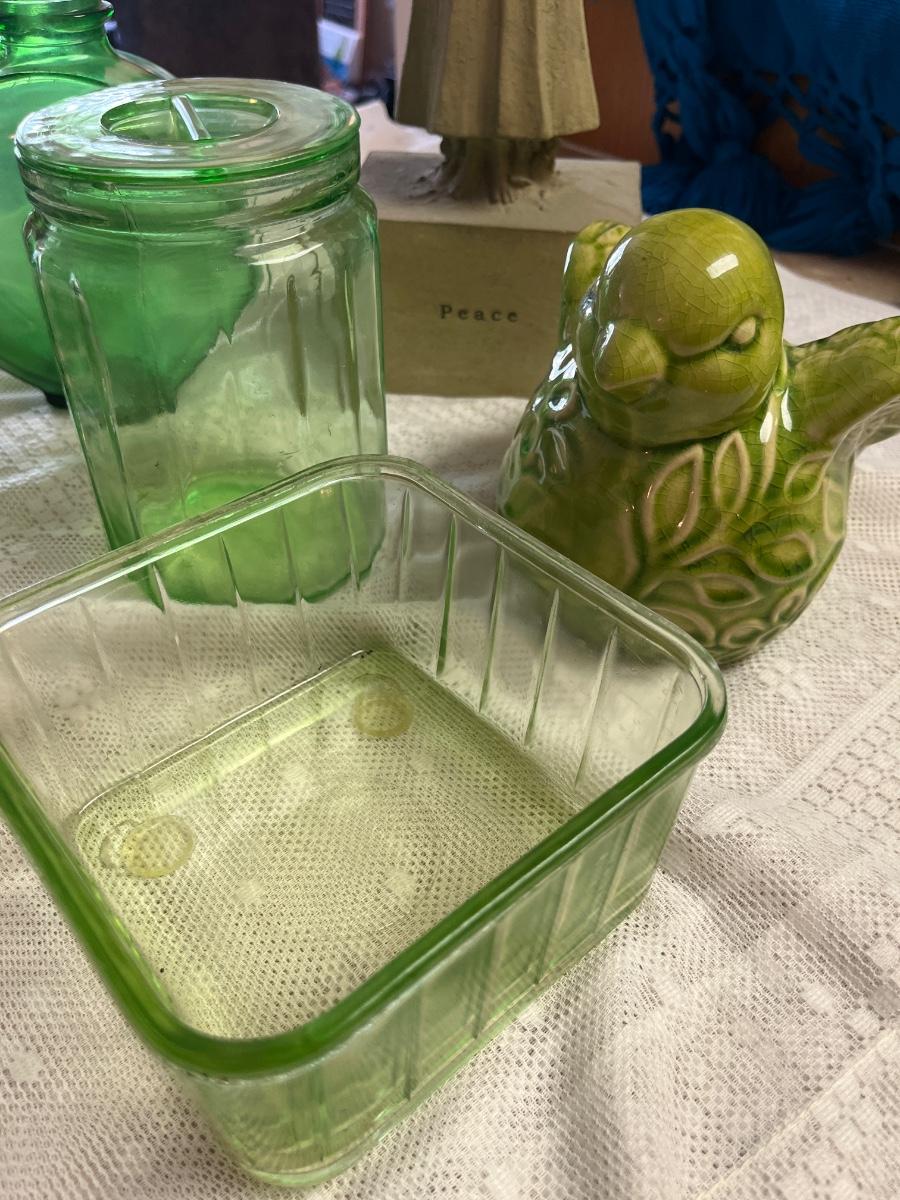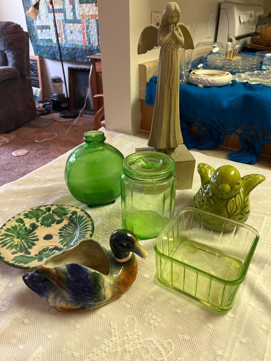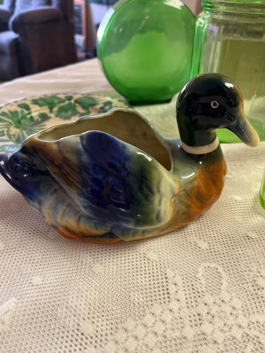 K25- Vintage duck planter, green depression glass, Mexico plate, statue