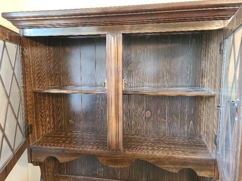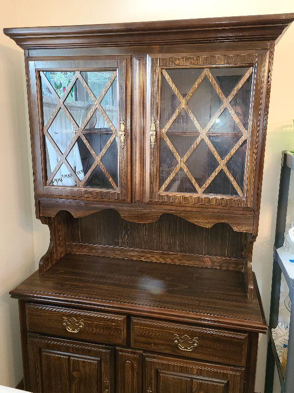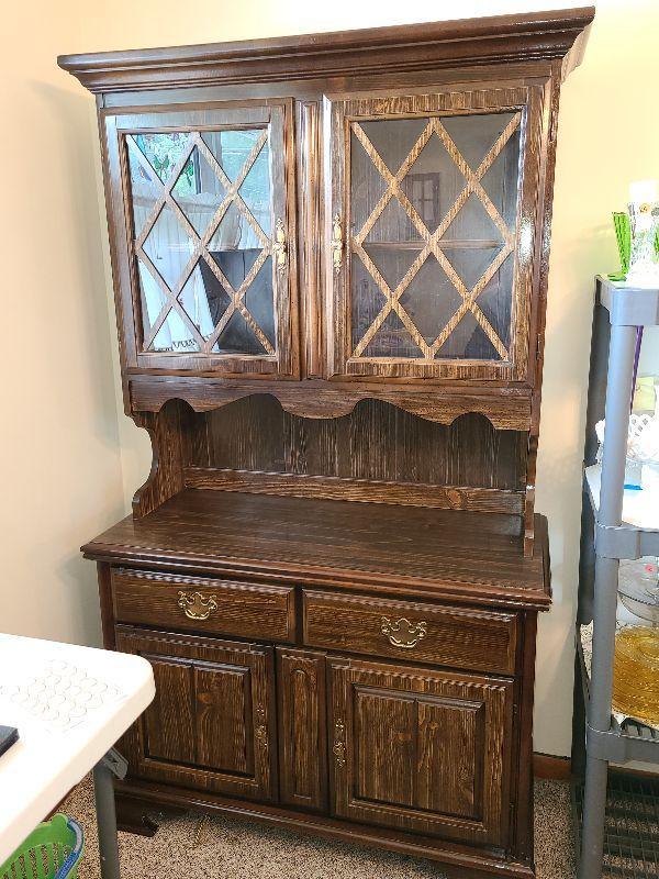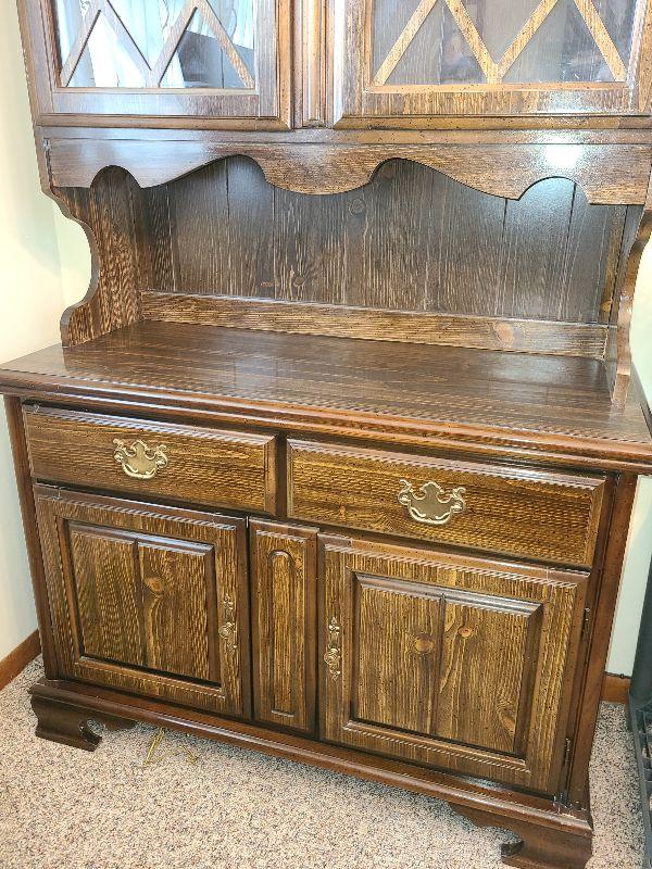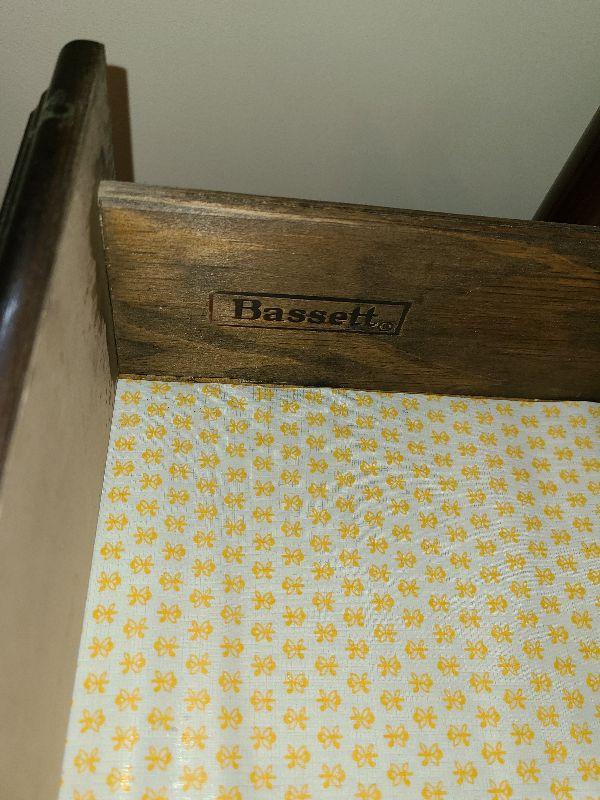 This is a nice vintage piece from Basset Furniture Makers. Solid and does come apart into two pieces. You will need someone to help you move. Please see all pictures for exact contents of the lot, condition of the items, and if measurements if taken. Thank you for looking and have fun bidding.