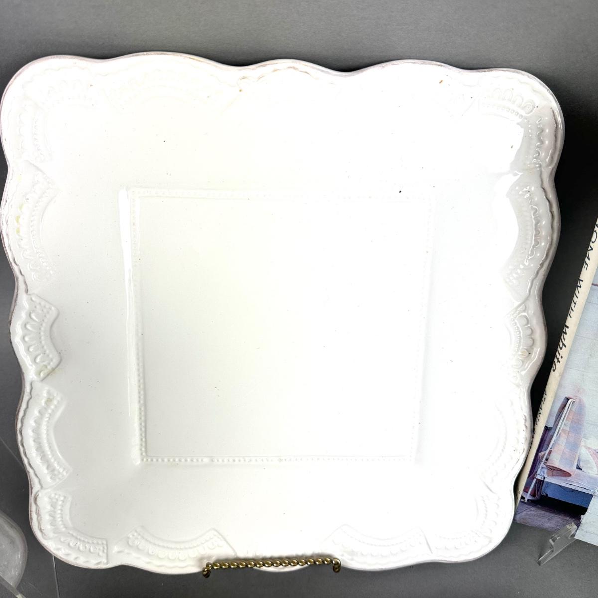There is a platter that is 17"L, Plate that is 12" diameter, dish with lid that is 7" x 7".